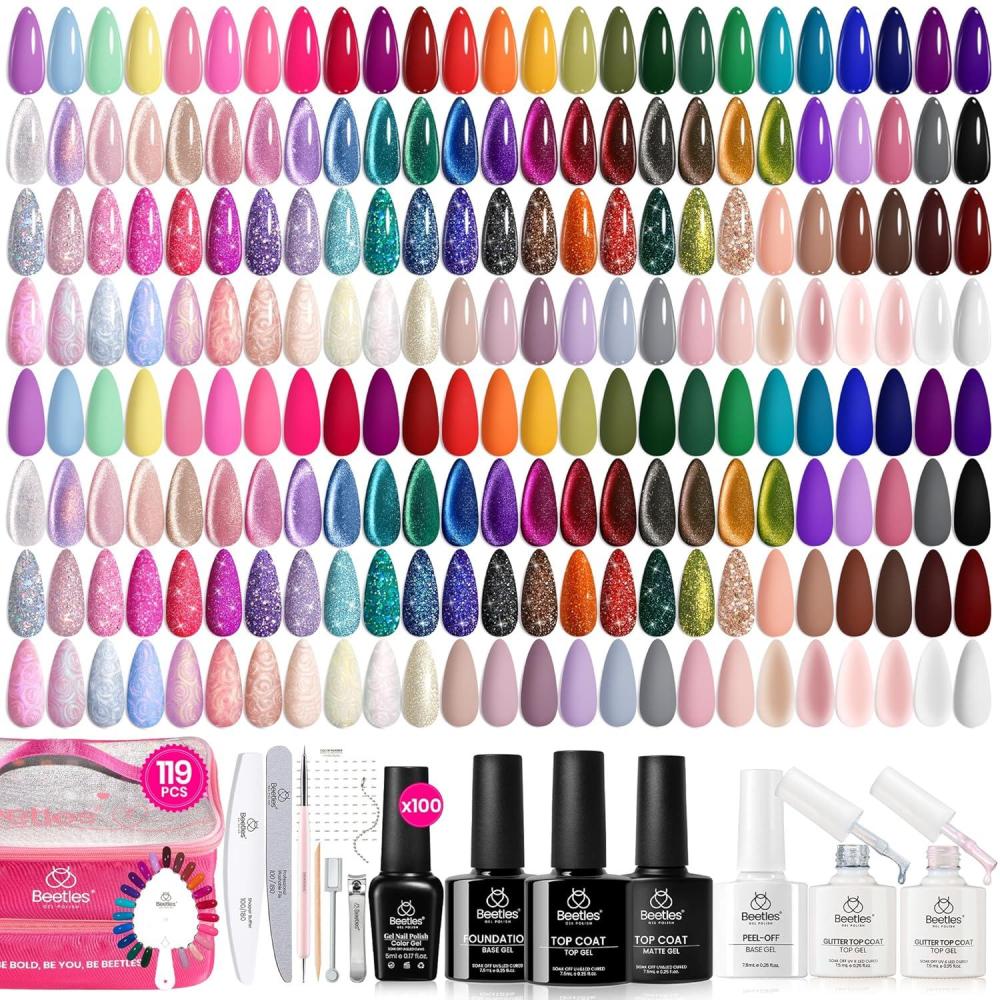 Beetles 100 Colors Gel Nail Polish Set, 119 PCS Nail Polish Kit All Season Cat Eye Pink Blue Jelly Glitter Pearl Gel Polish & 5Pcs Base Top Coat Soak off UV Manicure Nail Art Home Gifts for Women(32 Colors Beginner Kit)