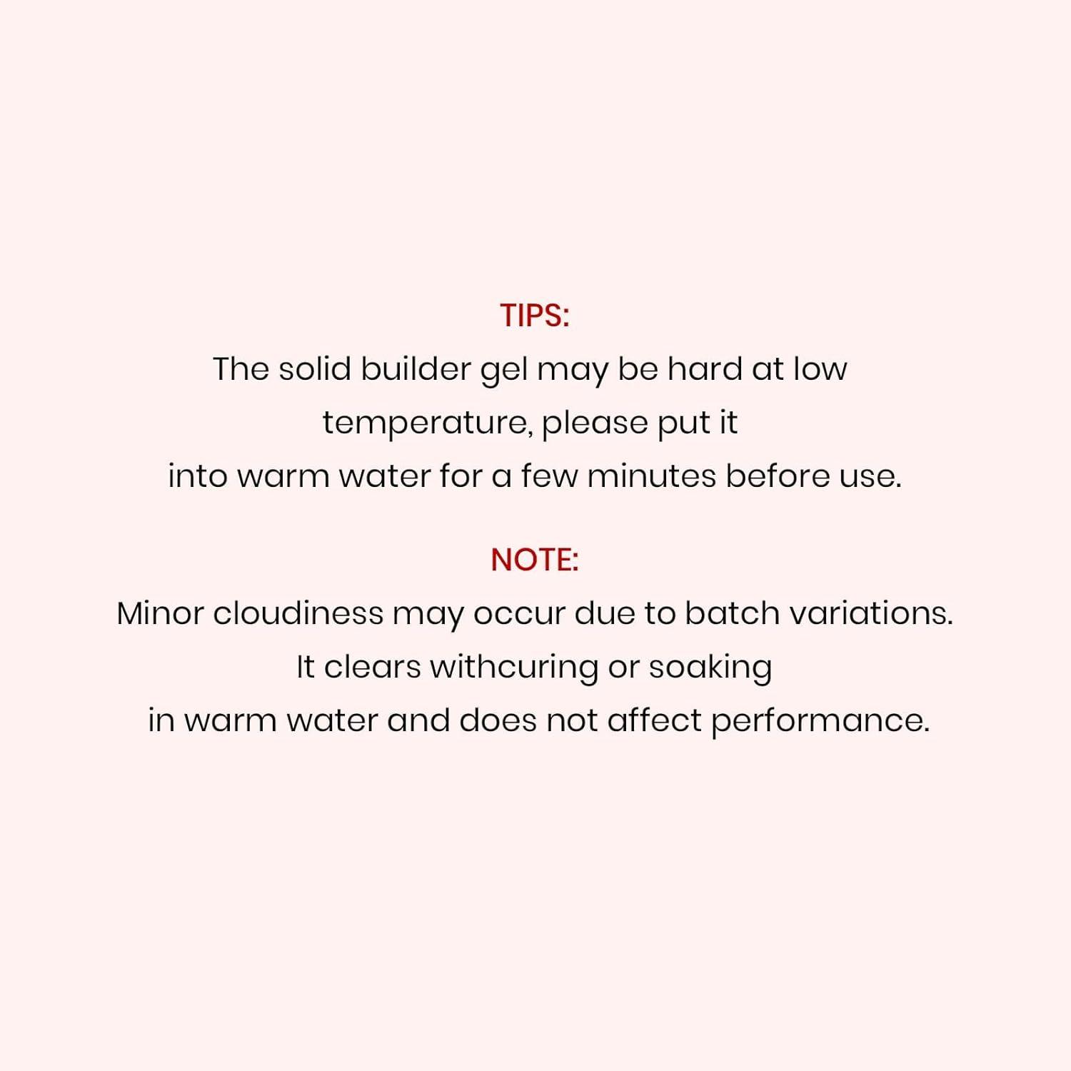 Long Lasting:This solid builder gel is made from natural resin and healthy ingredients, low smell. With proper application(buffering, cleaning, base & top coat and cured under nail lamp 60-120s), the solid builder gel for nails can last 28+ days.(Tips: If the solid builder gel becomes thick, soak it in warm water for a few minutes or hairdry before use.And Please keep the 3D nail art gel in a cool place)