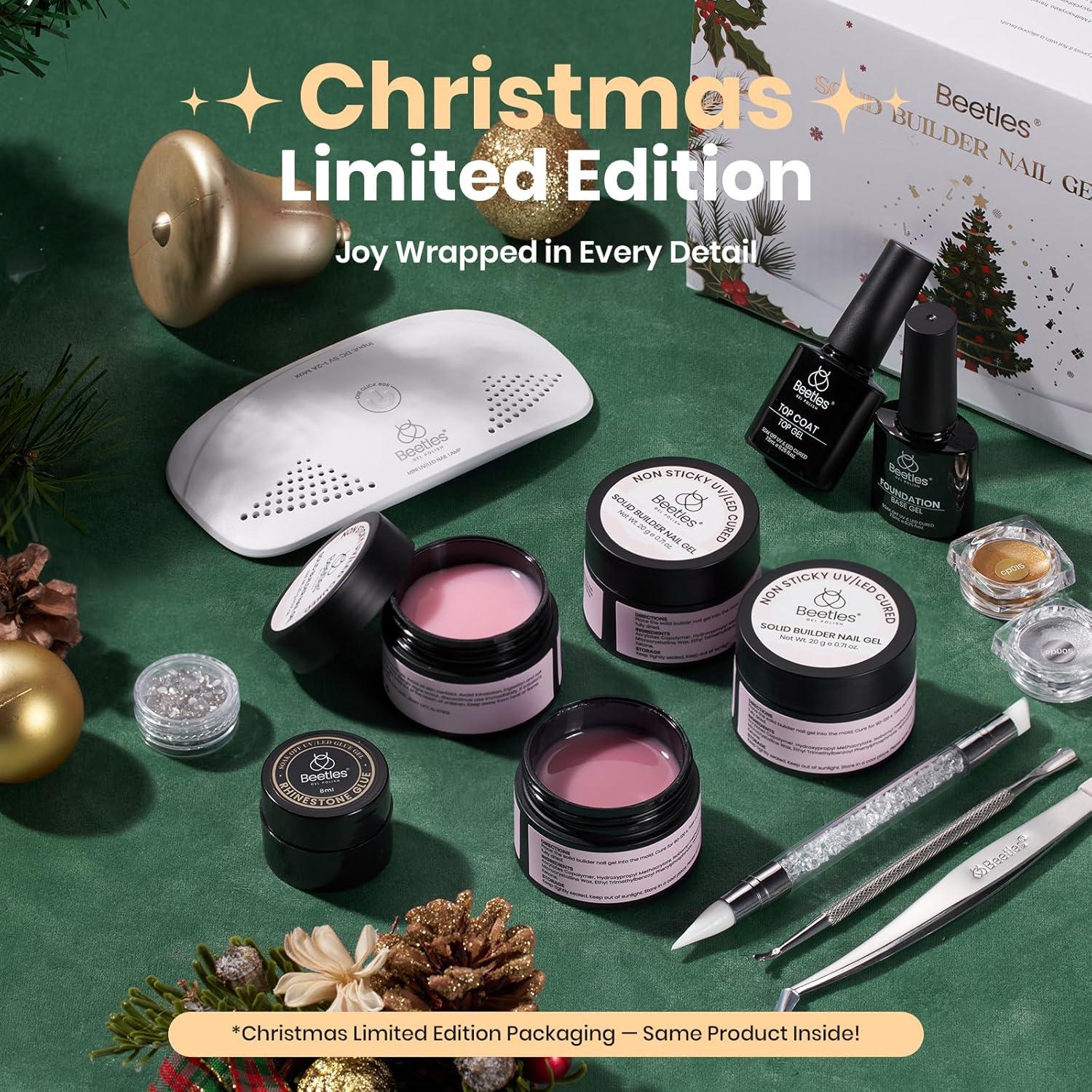 Beetles 3D Gel Nail Art Kit-Christmas Limited:4*20g(Clear,Pink,Light Pink, White),Base Coat & Top Coat,Nail Lamp,1* Nail File, Tweezers& Metal Cuticle Pusher,1*Double-Ended Silicone Nail Art Pen,2*Chrome Powders,1* Rhinestones,1* Rhinestones Glue,1*Pack of Dual Forms,3D Nail Mold,1*Set of Silicone Finger Sleeves