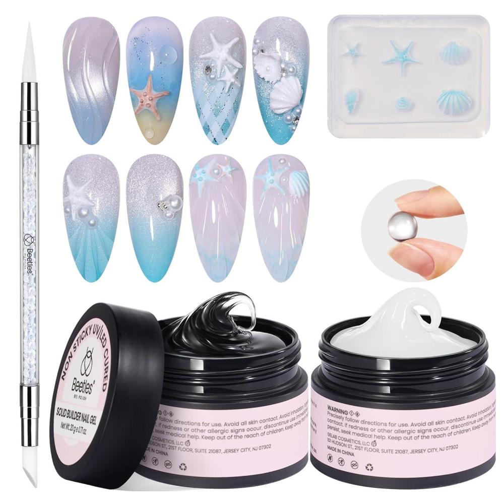 Beetles 3D Gel Nail Art with 3D Mold-2 Pcs Sandy Glow Clear and White Solid Builder Gels for Nails Non-Sticky Sculpting with Dual-Ended Sculpture Pen, Beginner Friendly DIY at Home,UV LED Lamp Needed(B1-White Solid Builder Nail Gel)