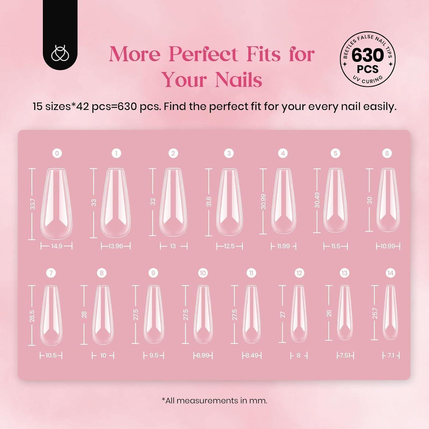 Beetles 3Pcs 15ml HEMA-Free Nail Prep & Glue Set, Professional Protein Nail Prep Acid-Free Dehydrate Bond Primer, TPO Free 9 in 1 Nail Glue Gel for Nail Tips Clear Press On Nails Nail Extension(5-2-Long Coffin 15 Sizes 630PCS (Clear Nail Tips))