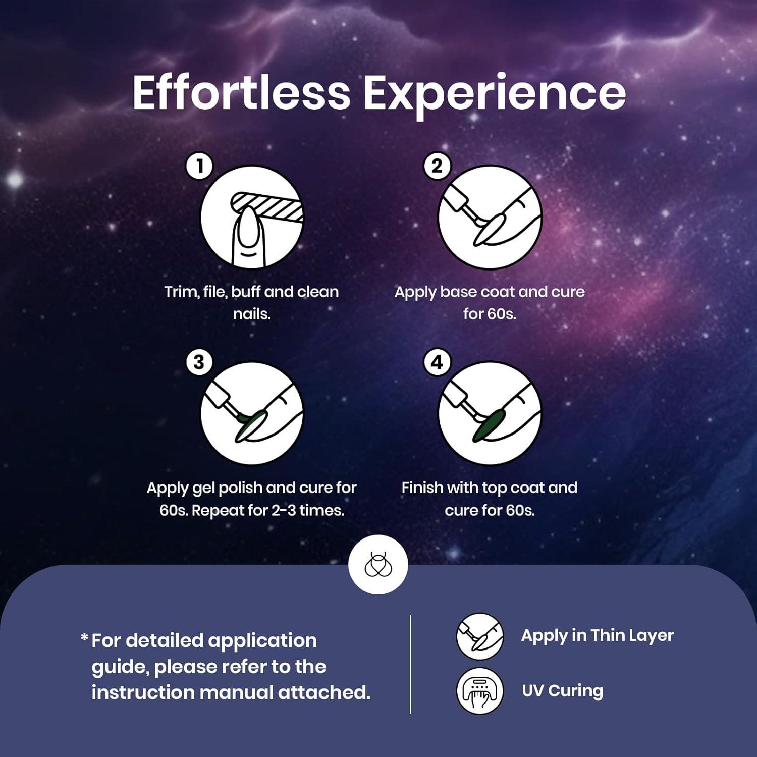 Speed Curing with Uv/Led Nail Lamp: The blooming gel polish needs to be cured under Led/UV light for about 60-120s.If you feel a stinging sensation during curing, it is recommended to remove your hand from the lamp. Resume curing once the sensation returns to normal.