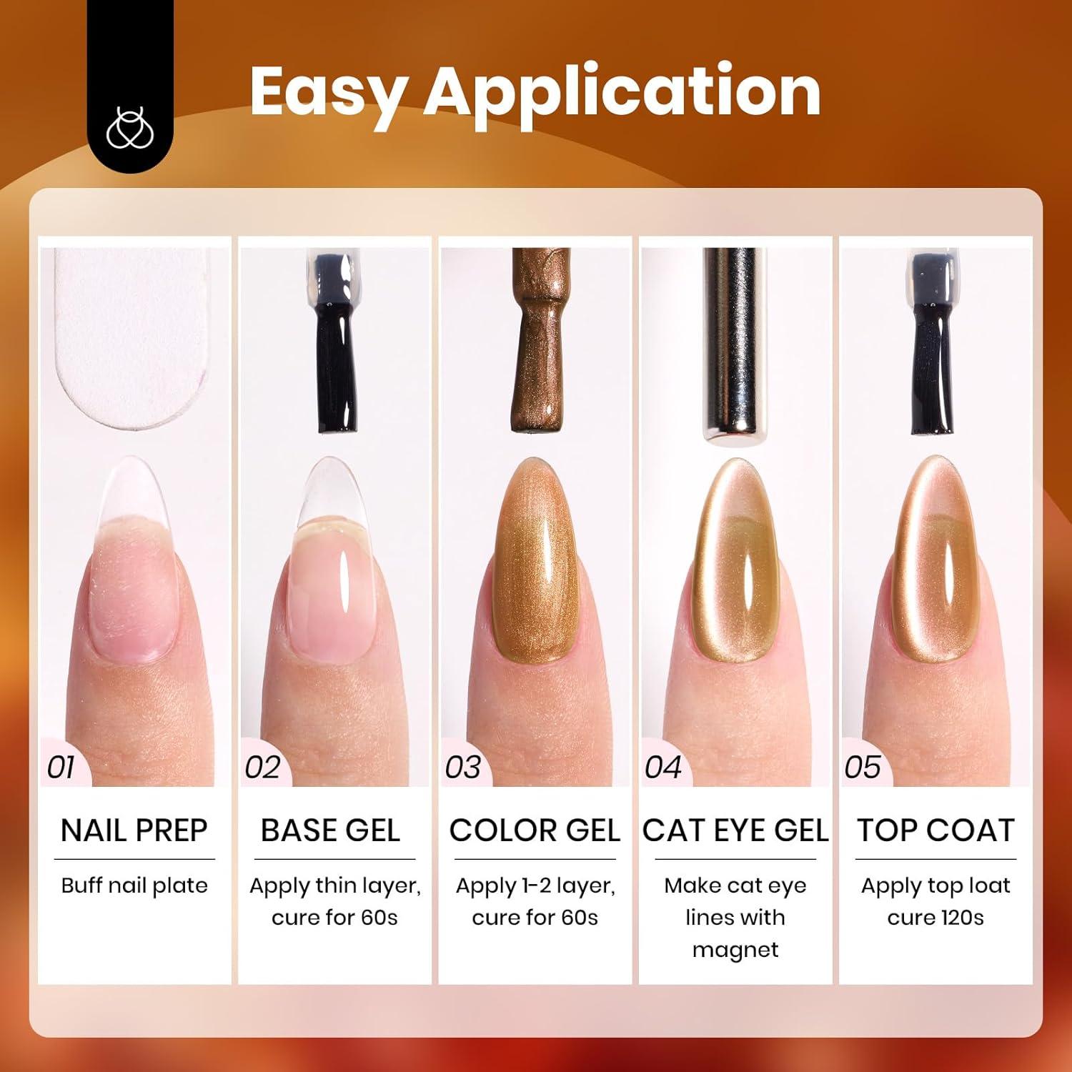 【Speed Curing with Uv/Led Lamp】The brown cat eye gel polish kit needs to be cured under the uv/led light. The average time for uv/led lights is 60-120 secs. It remains sticky after curing and must be used with a base coat and top coat! (Note:This item does not include a base&top coat, which needs to be purchased separately)