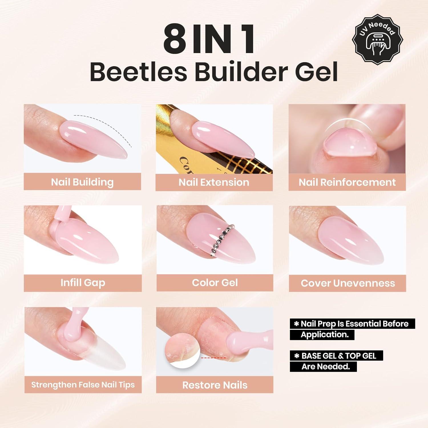 Beetles 8 in 1 Building Nail Gel Set: 2 Pcs Clear colors Beetles Builder Gel in a bottle (0.5 fl.oz.15 mL each bottle), which can thickening overlay,build apex, nail extension, get stronger nails, nail enhancement, cover unevenness, seal nail art, rhinestone, suitable for DIY manicure and nail salon use, perfect for diy fall nails or halloween nails. (*Warm Tips: Needed to be used with Beetles Base Gel, Base gel need to be purchased separately.)