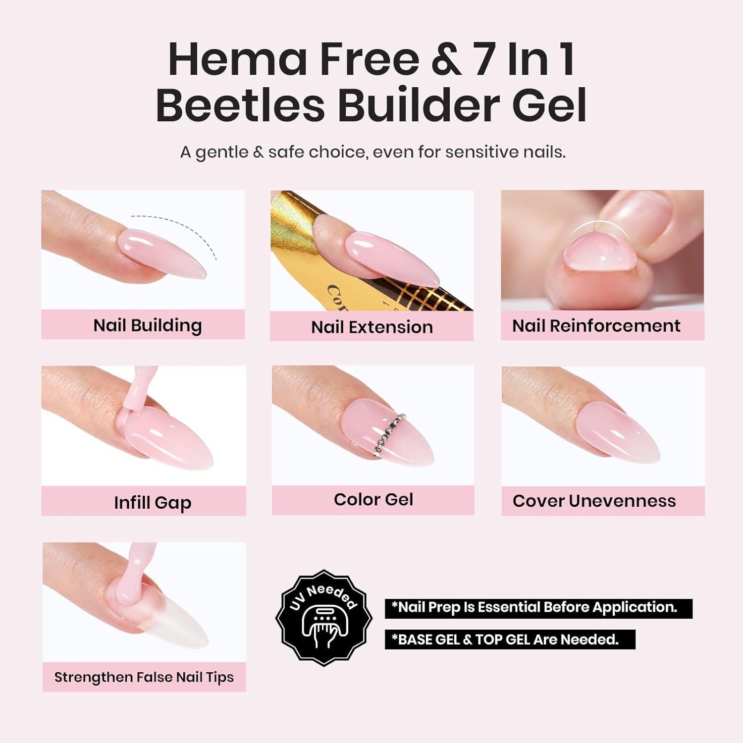 WARNING: This beetles builder gel set is intended for use by adults only. Do not use it on children or minors. Avoid use during pregnancy or breastfeeding. Not recommended for individuals with sensitive or allergy-prone skin. If irritation occurs, discontinue use immediately and consult a physician(If the gel thickens over time, place the container in warm water 120–144°F to restore its smooth consistency without affecting performance)