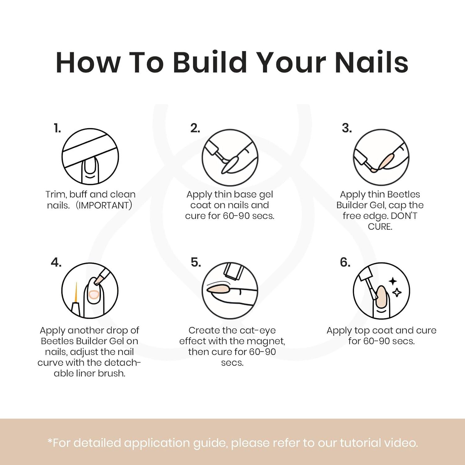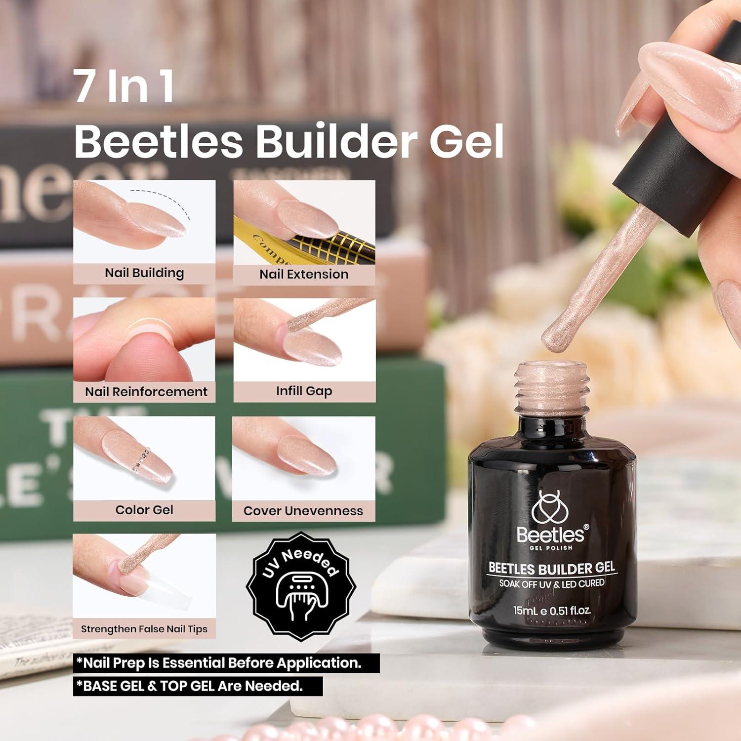 Beetles Builder Gel for Nails:Perfect for thin, soft or flat nails, our builder nail gel strengthens the natural nail and helps you build a flawless apex with ease. The formula stays put yet moves when you need it to, featuring slight self-leveling for effortless application. Stronger than regular polish but lighter than acrylic and hard gels, it delivers durability without the monomer smell or dust. Create salon-perfect nails with just a few strokes