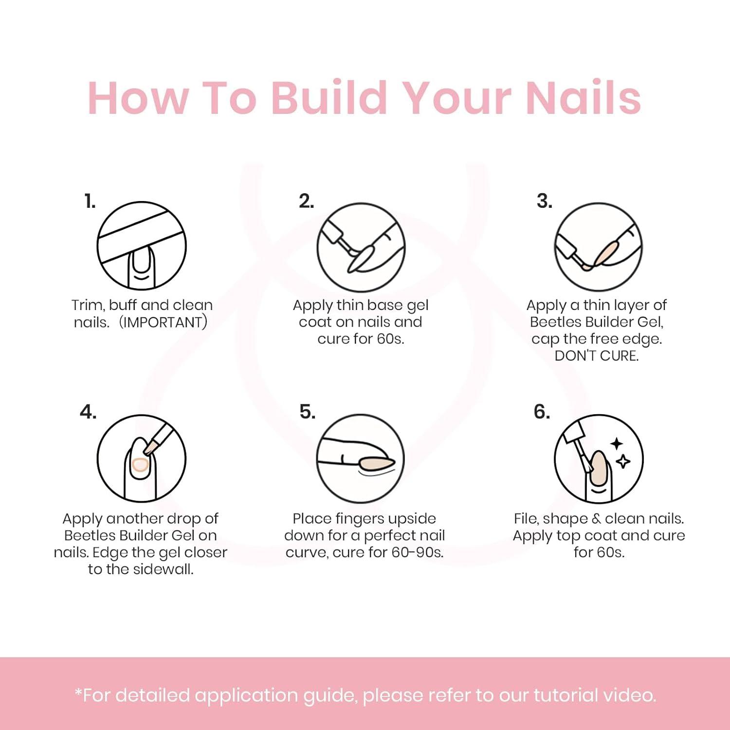Beetles Builder Gel for Nails:Perfect for thin, soft or flat nails, our builder nail gel strengthens the natural nail and helps you build a flawless apex with ease. The formula stays put yet moves when you need it to, featuring slight self-leveling for effortless application. Stronger than regular polish but lighter than acrylic and hard gels, it delivers durability without the monomer smell or dust. Create salon-perfect nails with just a few strokes