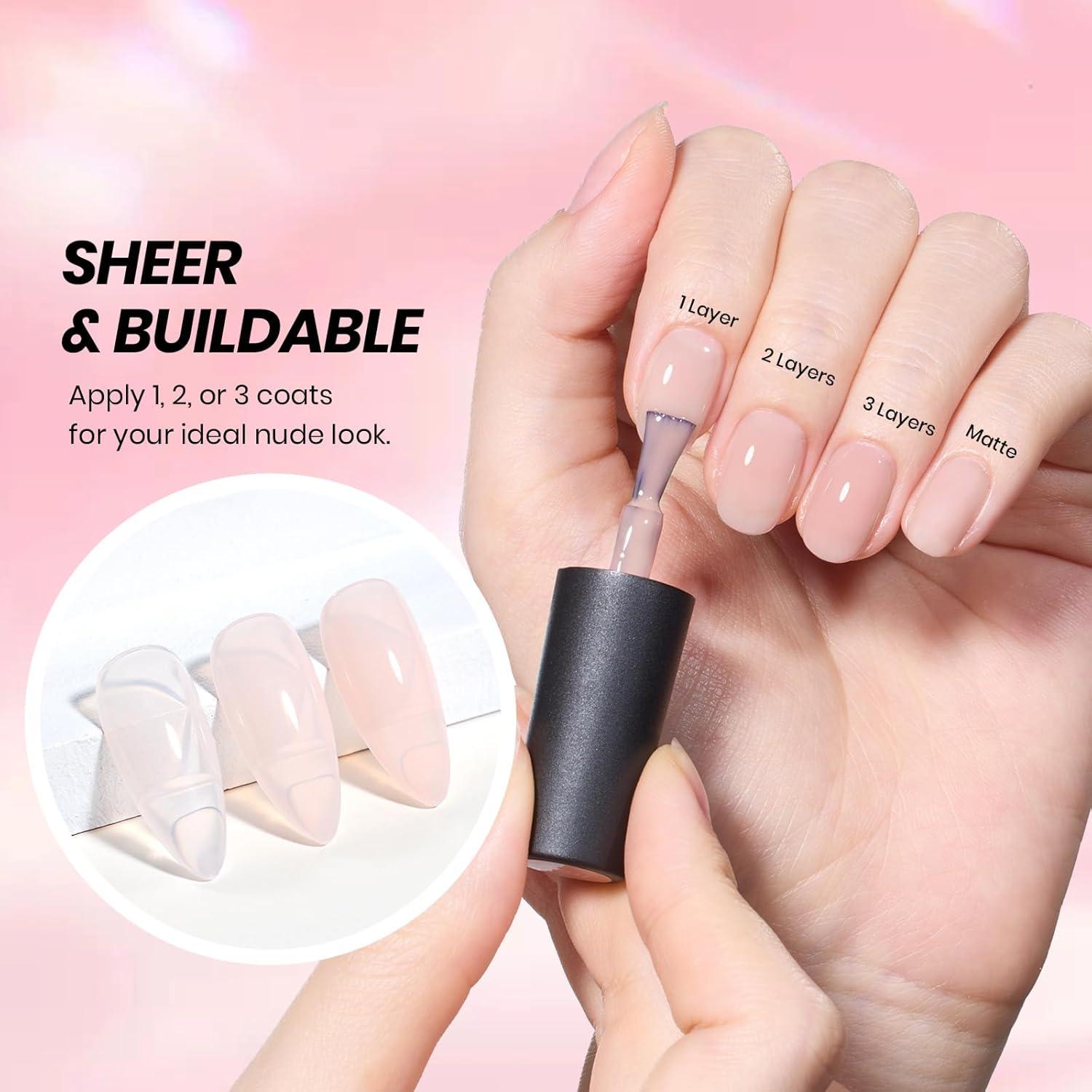 【Sheer, Breathable & Buildable】Apply several layers to build up the color from clear translucent to solid opaque. Each layer, whether one, two, or three layers, creates a different effect—never heavy, never chalky, always natural.This nude gel polish is UV gel and need to be cured 60-120s. (Note: It is still sticky after curing and must be used with a base coat and top coat, which are not included and need to be purchased separately)