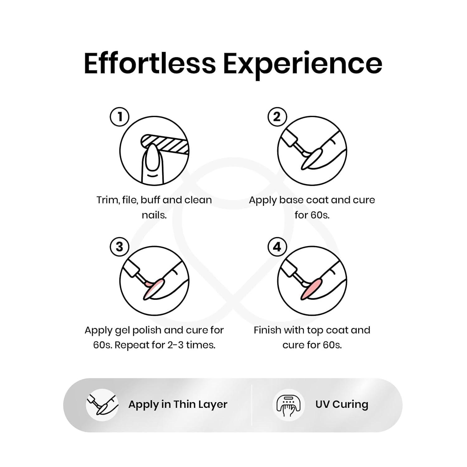 【Sheer, Breathable & Buildable】Apply several layers to build up the color from clear translucent to solid opaque. Each layer, whether one, two, or three layers, creates a different effect—never heavy, never chalky, always natural.This nude gel polish is UV gel and need to be cured 60-120s. (Note: It is still sticky after curing and must be used with a base coat and top coat, which are not included and need to be purchased separately)