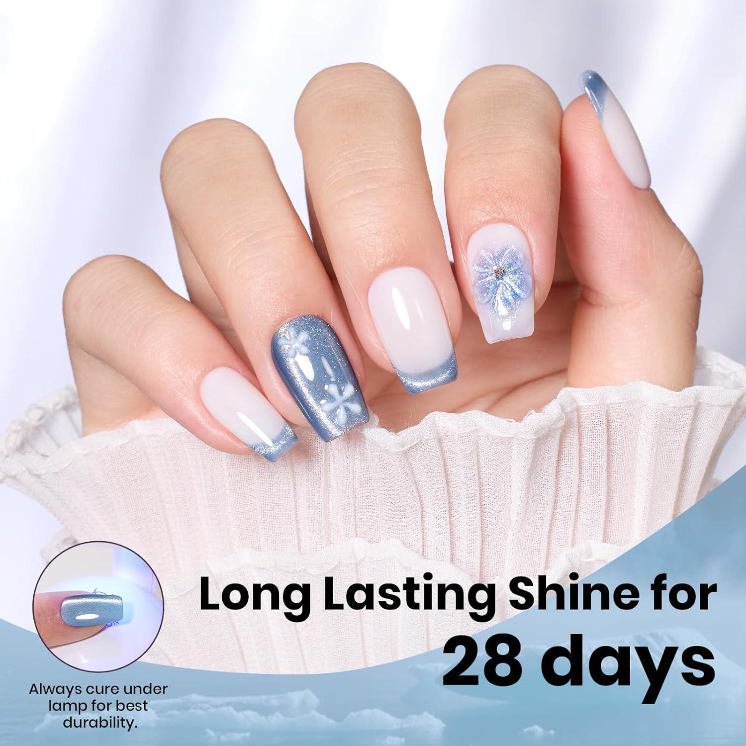 【Speed Curing with Uv/Led Lamp】The blue glitter gel polish kit needs to be cured under the uv/led light. The average time for uv/led lights is 60-120 secs. It remains sticky after curing and must be used with a base coat and top coat! (Note:This item does not include a base&top coat, which needs to be purchased separately)