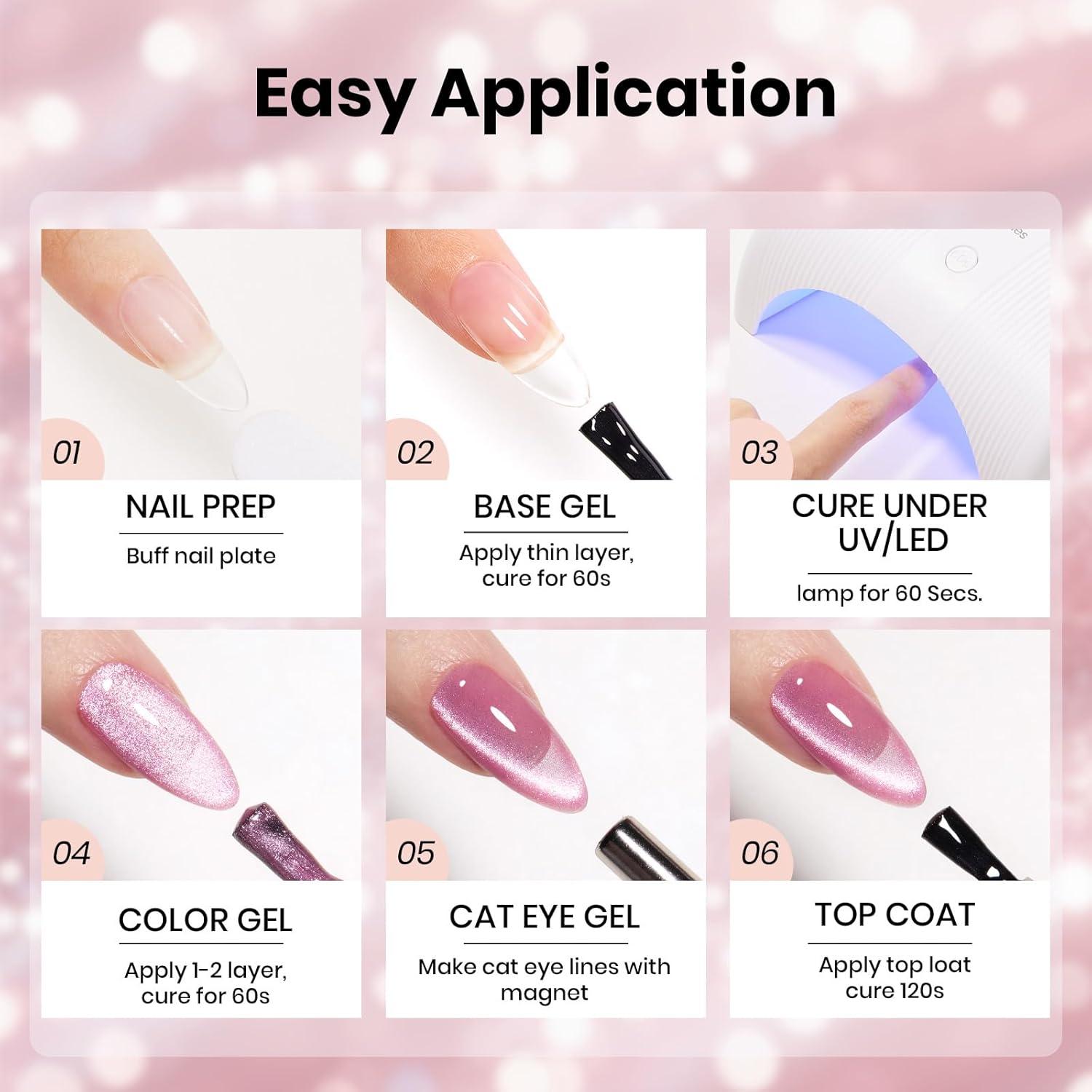 【Warm Tips】Please conduct a skin test before use with blue cat eye gel nail polish. Professionally formulated and only used for nails. Place the magnetic stick over the surface about 3-5mm for 5-10 secs to get your desired effect! After repeatedly sucking the cat eye color gel without any effect, the magnetic powder will become ineffective. You can add a layer to suck the cat eye gel again