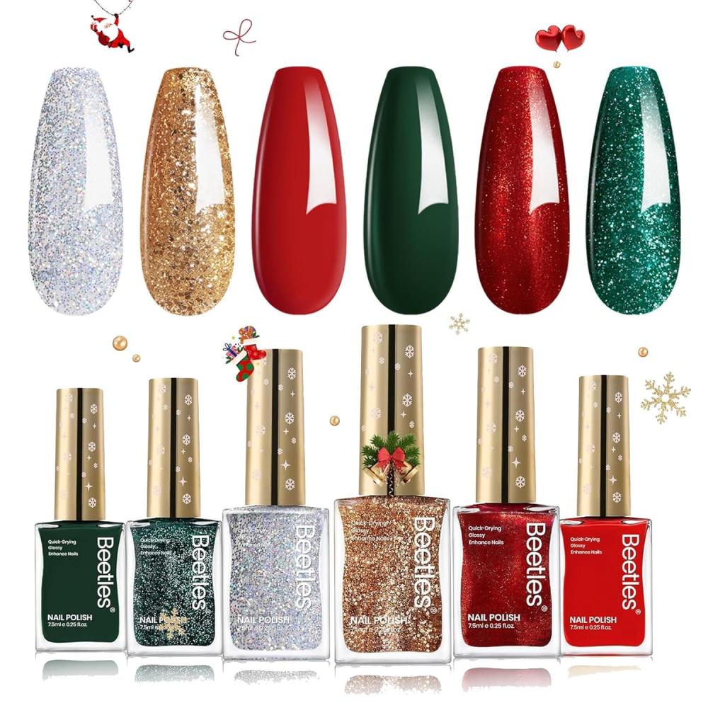 8 Days Long-Lasting: Durable 6-color Christmas nail polish that won't fade or peel off, keeping your nails beautiful for over 8 days. It contains Christmas red nail polish quick dry, Christmas green nail polish, red glitter nail polish, shiny green nail polish, gold Christmas glitter nail polish, silver Christmas glitter nail polish.