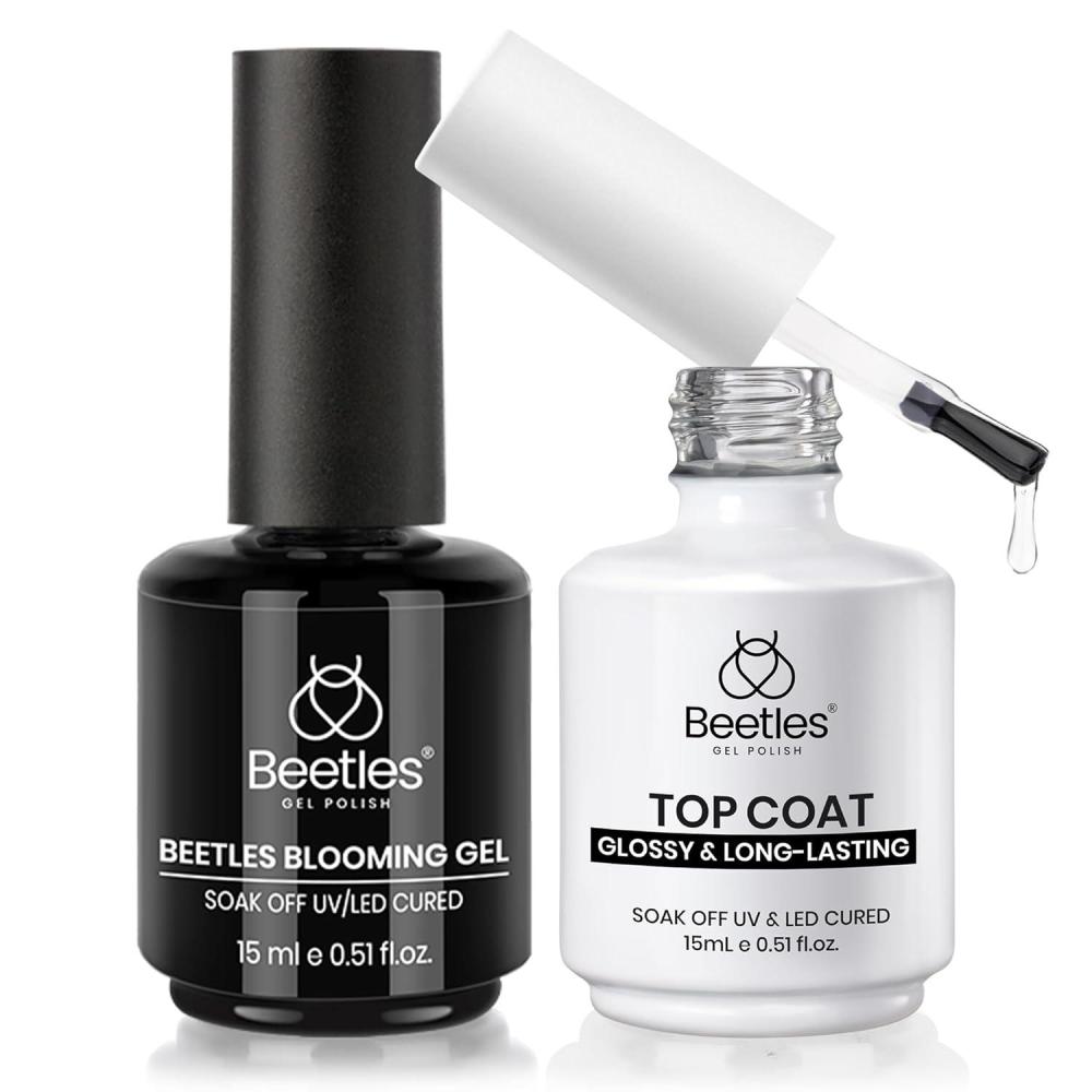 Beetles Extra Glossy No Wipe Gel Top Coat, 2 Pcs 15ml Super Shiny Clear Glossy Top Coat Gel Nail Polish, Soak Off Uv Nail Lamp Nail Salon Manicure DIY Home Gifts for Women(Blooming Gel and Top Coat)