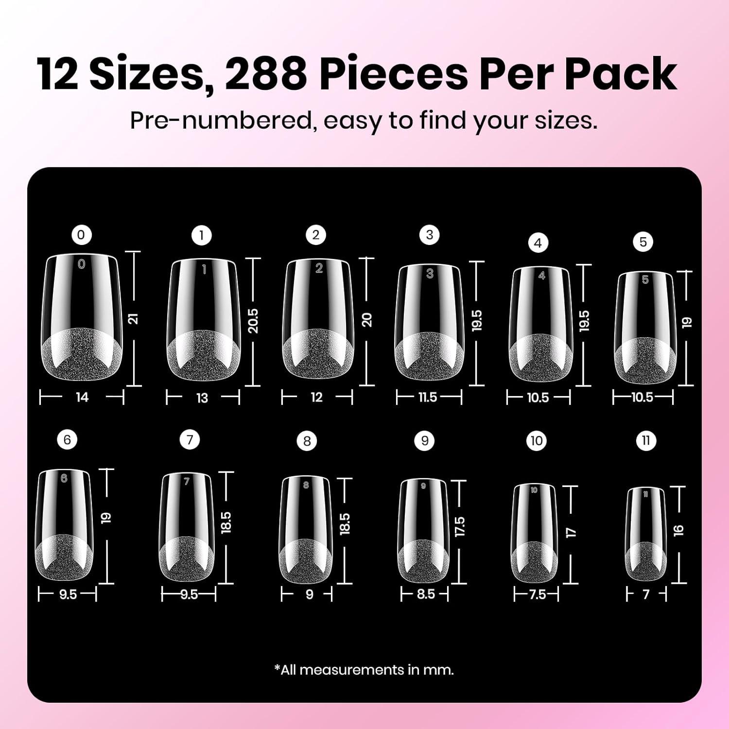 【Fit Nails Perfectly】– This 288 PCS false nail tips set comes in 12 sizes for effortless matching to each finger. Each nail tip in the transparent series features a thinner edge to fit your natural nails. The pre-filed design reduces the need for extensive filing. Beetle nail tips offer a more natural appearance, resembling nails that have grown out naturally.