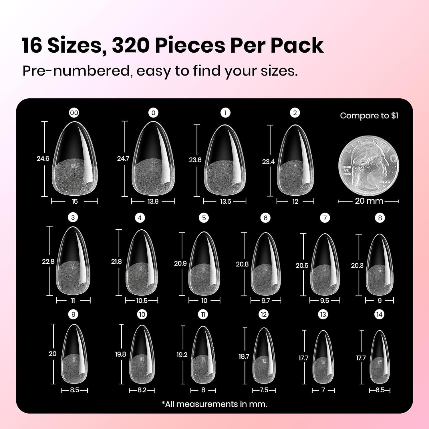 Beetles Gel Nail Kit Etch-X, Almond Short, 288pcs 12 Sizes Nail tips, with 10ml Hema-Free Nail Glue Gel, Glue on Nails for Acrylic Press On Nail, Pre-Etched Half Matte Extension Set for Home DIY(0-0-2-Medium Almond 320pcs (Curve-EX Nail Tips))