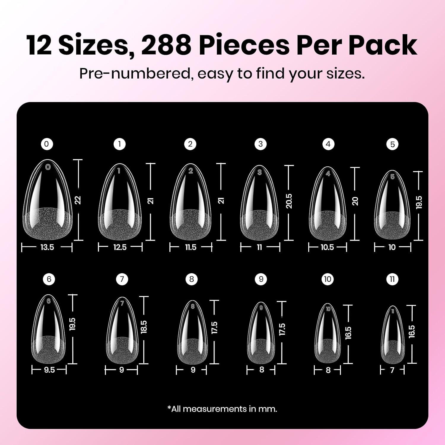 Beetles Gel Nail Kit Etch-X, Coffin Medium, 288pcs 12 Sizes Nail Tips, 3Pcs 15ml HEMA-Free Nail Glue Top Coat & Base Gel Set, with Mini Lamp, Press On Nail, Long Lasting Extension DIY Set at Home(2-2 Almond Medium 288pcs (Etch X Nail Kit))