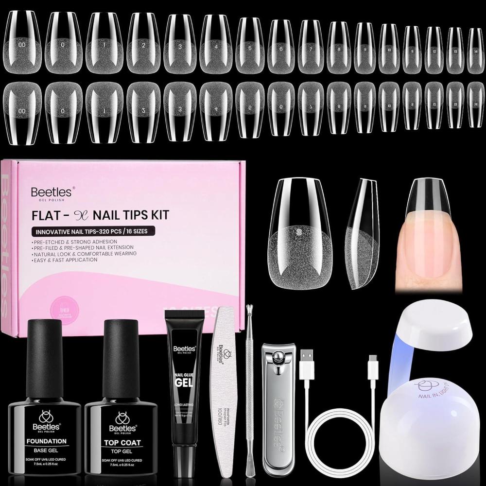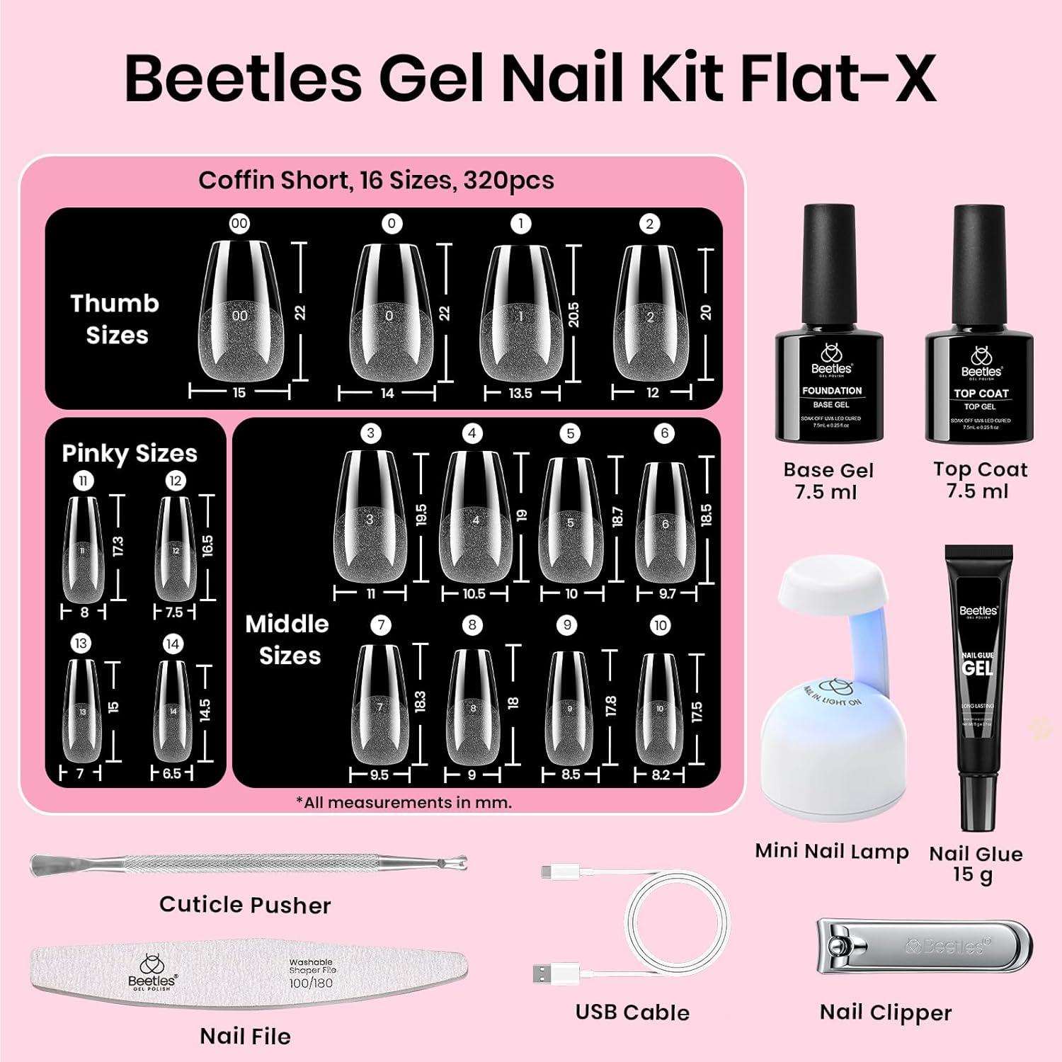 Beetles Gel Nail Kit Flat-X, Square Short, 320pcs 16 Sizes Nail tips, with 15g Nail Glue Gel Hands-Free, 7.5ml Base Gel & Top Coat, Mini Lamp, for Acrylic Press On Nail, Extension DIY Set at Home(4-5 Coffin Medium 320pcs (16 Sizes Flat-X Kit))