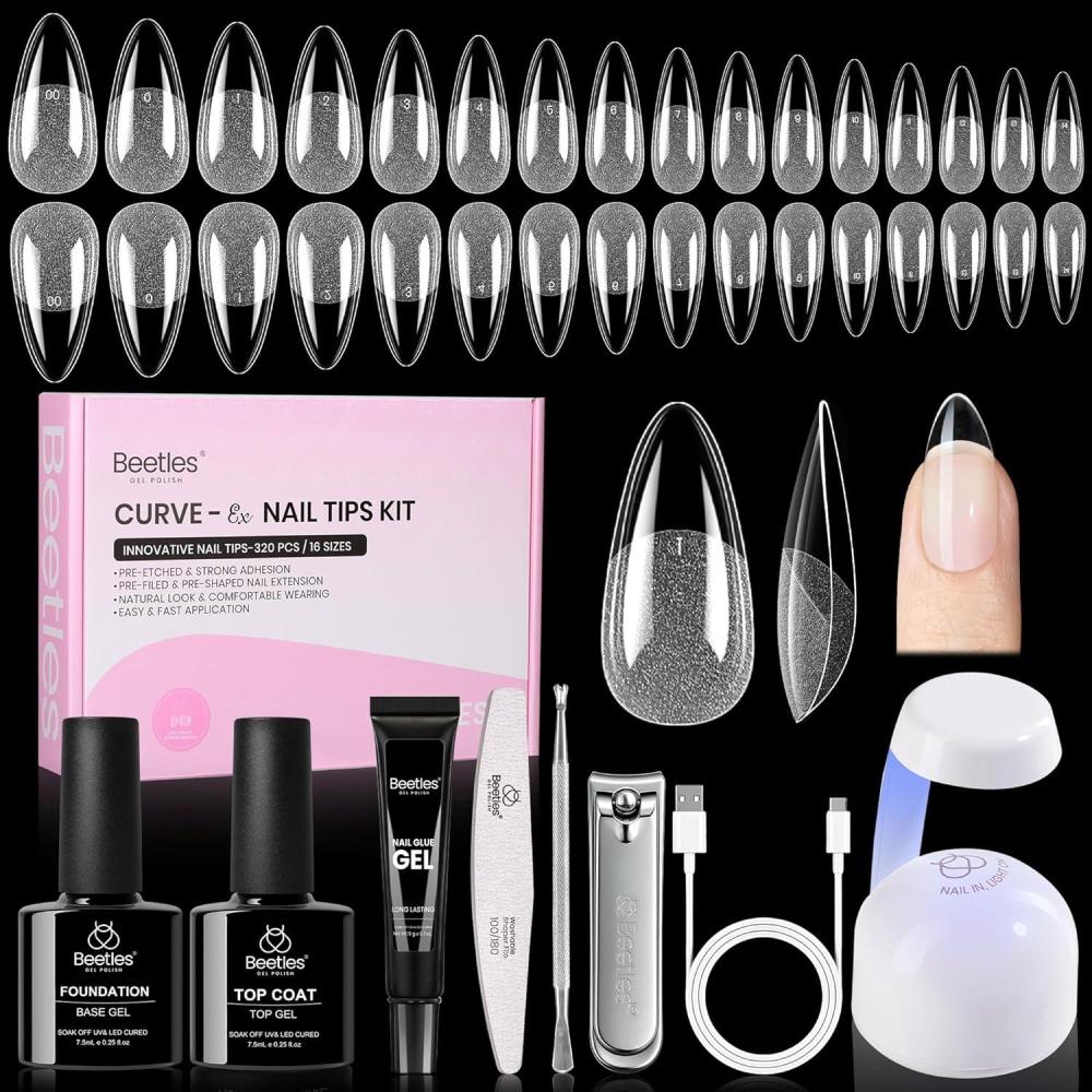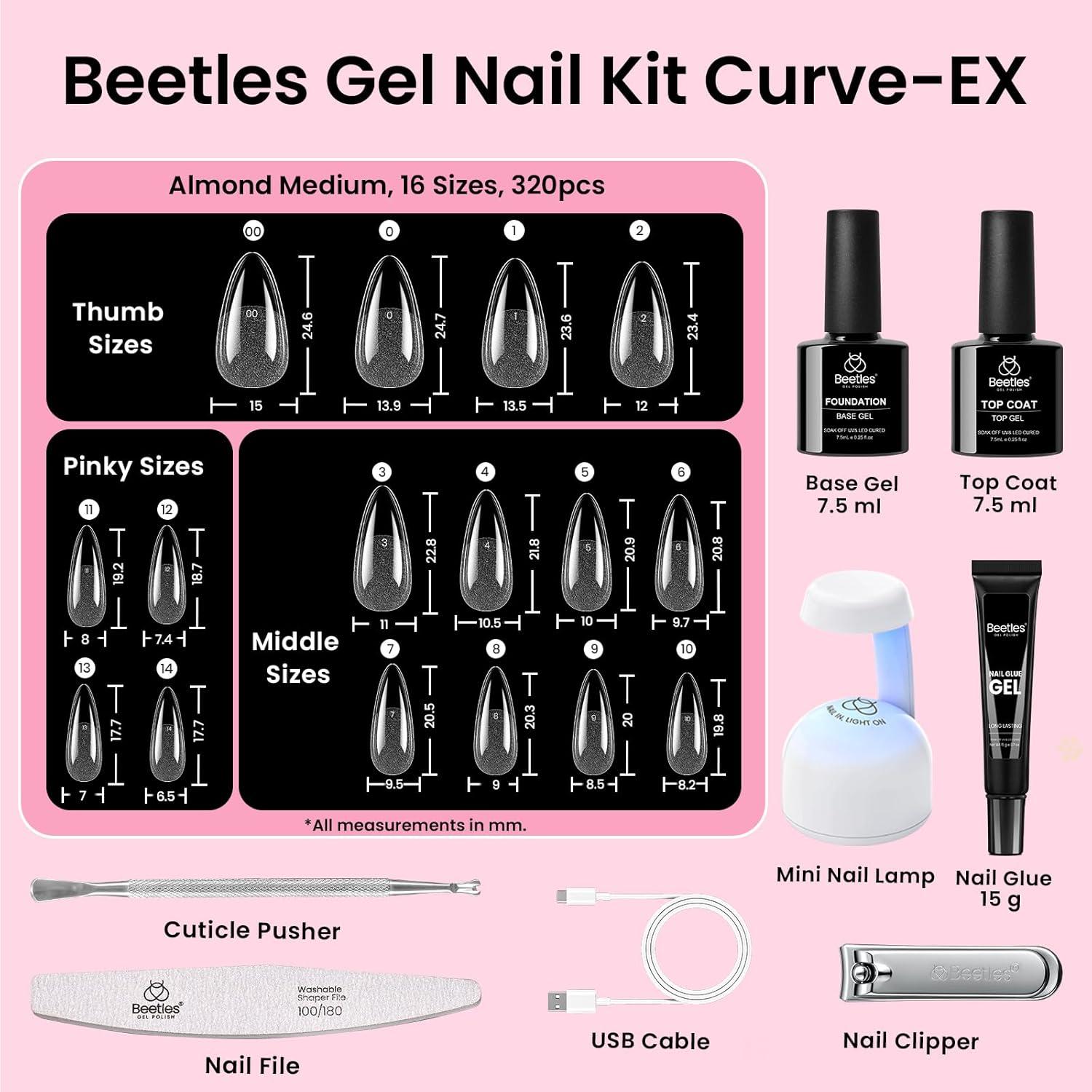 Beetles Gel Nail Kit Flat-X, Square Short, 320pcs 16 Sizes Nail tips, with 15g Nail Glue Gel Hands-Free, 7.5ml Base Gel & Top Coat, Mini Lamp, for Acrylic Press On Nail, Extension DIY Set at Home(5-1 Almond Medium 320pcs (16 Sizes Curve-EX Kit))
