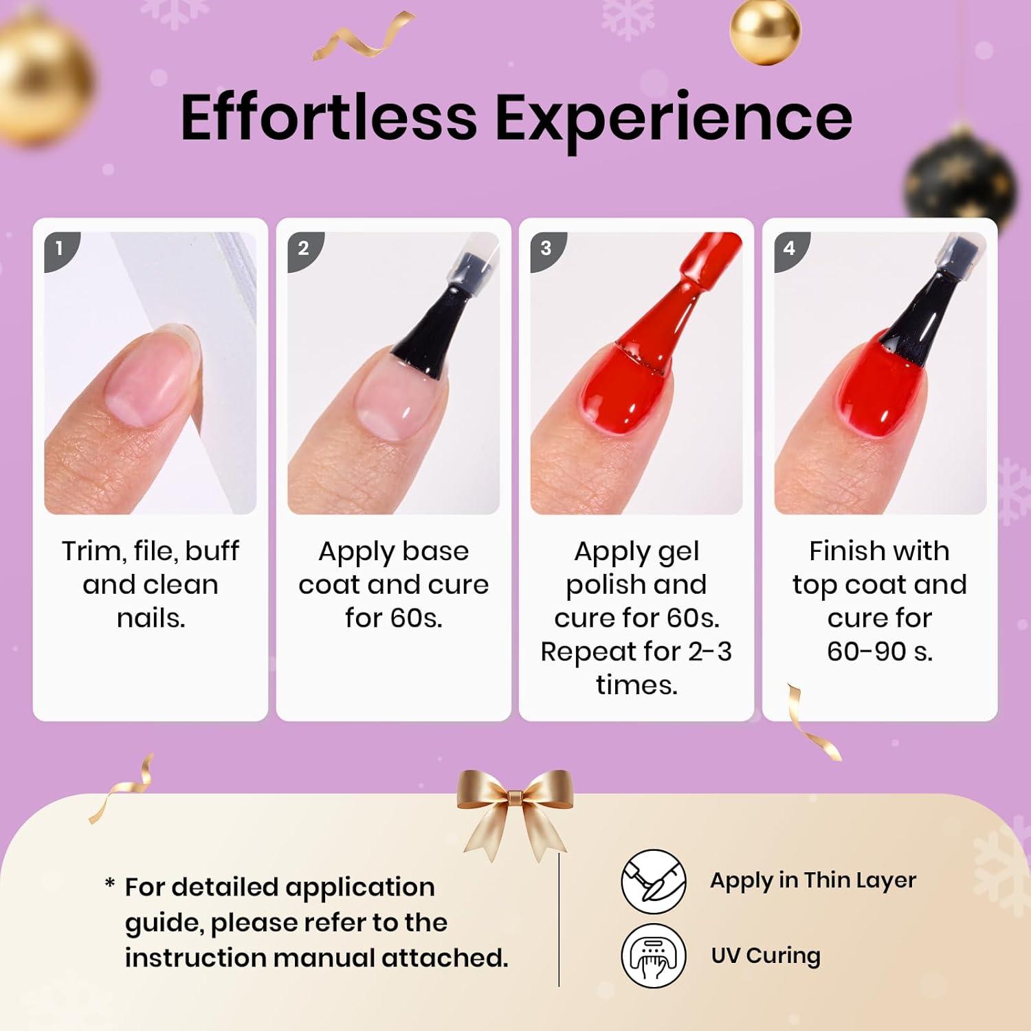 Long-Lasting Shine: With proper application and use of our base and top coat, our gel nail polish can last up to 21 days without chipping or fading. Enjoy a beautiful, long-lasting manicure from the comfort of your own home.