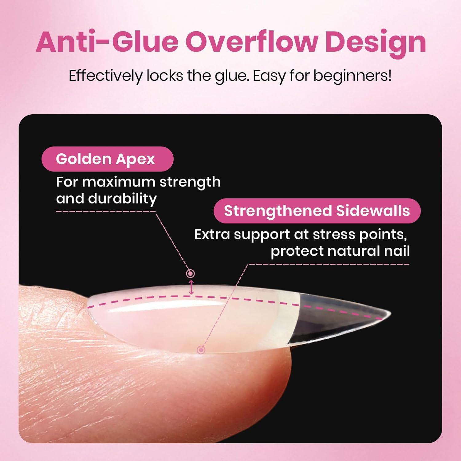 【Beginner-friendly Design】: Featuring a golden ratio of apex and anti-overflow glue structure, engineered for strength and a clean application. This design prevents breakage and controls glue overflow, making it easy for anyone—from beginners to professionals—to achieve a salon-quality finish. (Warm reminder: this set does not include nail glue).