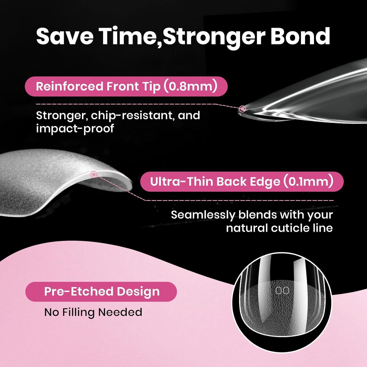 【Long Lasting 28 days+】: Upgraded pre-etched flat fake nail tips eliminate the need for shaping and filing, reducing polishing time and increasing the contact area between glue and tips for improved adhesion. The thin back edge seamlessly adheres to your natural nail, extending your nails in just 3 minutes and showing them off for over 4 weeks.