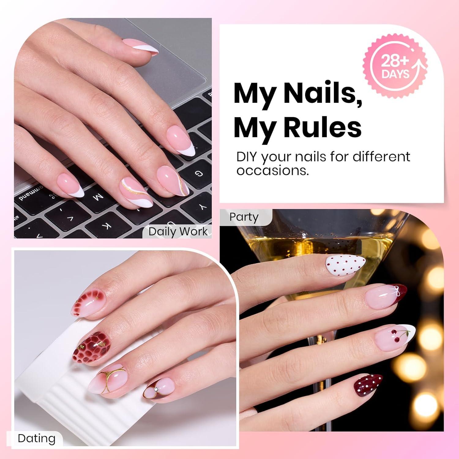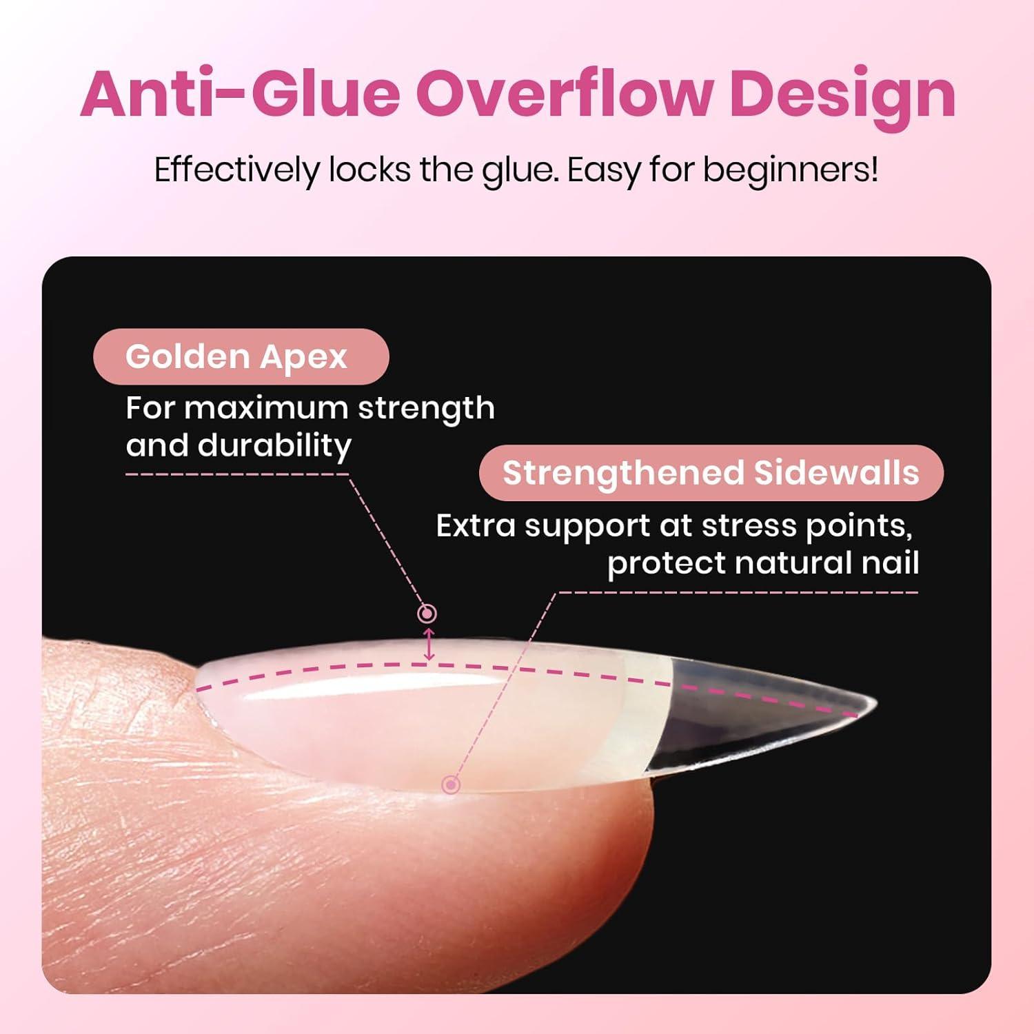 【Beginner-friendly Design】: Featuring a golden ratio of apex and anti-overflow glue structure, engineered for strength and a clean application. This design prevents breakage and controls glue overflow, making it easy for anyone—from beginners to professionals—to achieve a salon-quality finish. (Warm reminder: this set does not include nail glue).