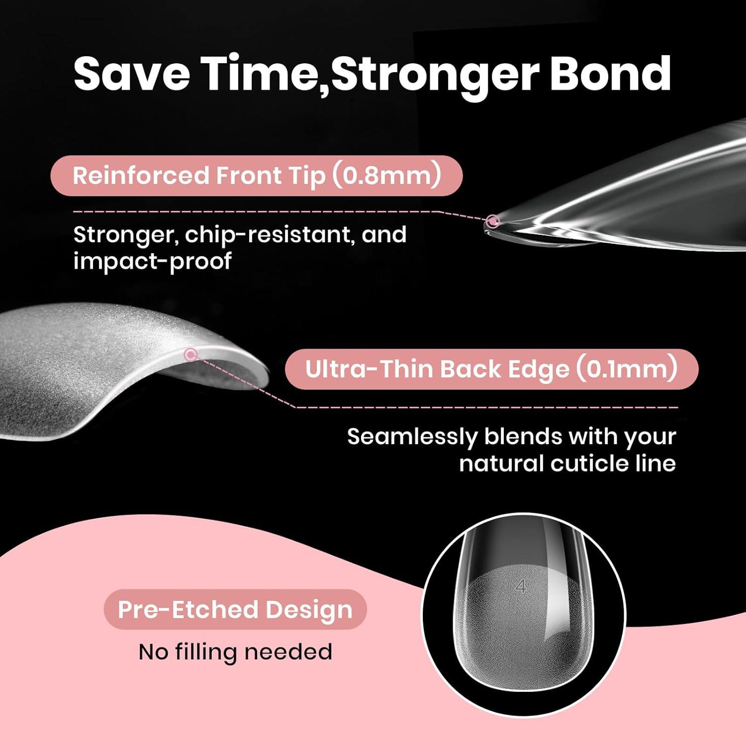 【Long Lasting 28 days+】: Upgraded pre-etched flat fake nail tips eliminate the need for shaping and filing, reducing polishing time and increasing the contact area between glue and tips for improved adhesion. The thin back edge seamlessly adheres to your natural nail, extending your nails in just 3 minutes and showing them off for over 4 weeks.