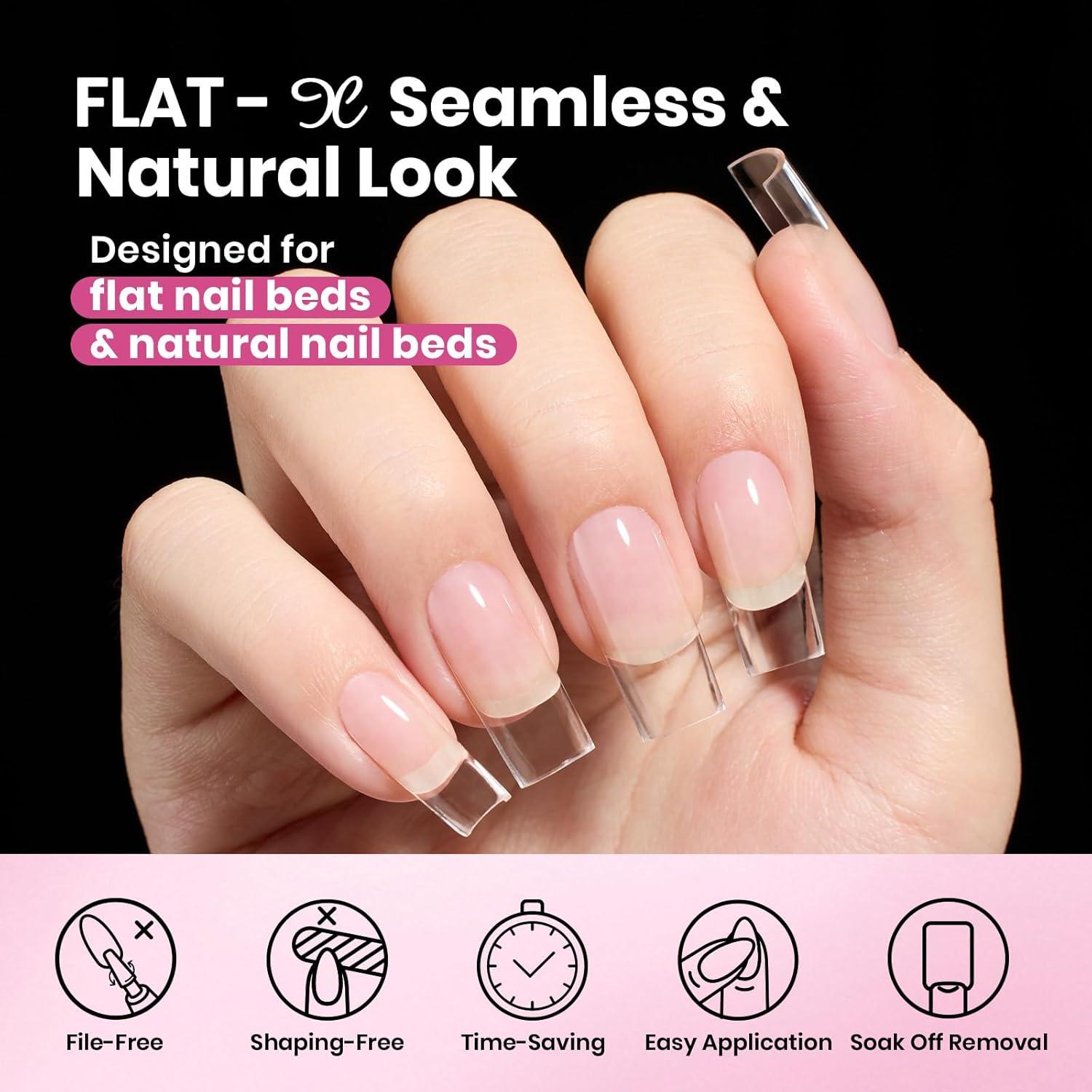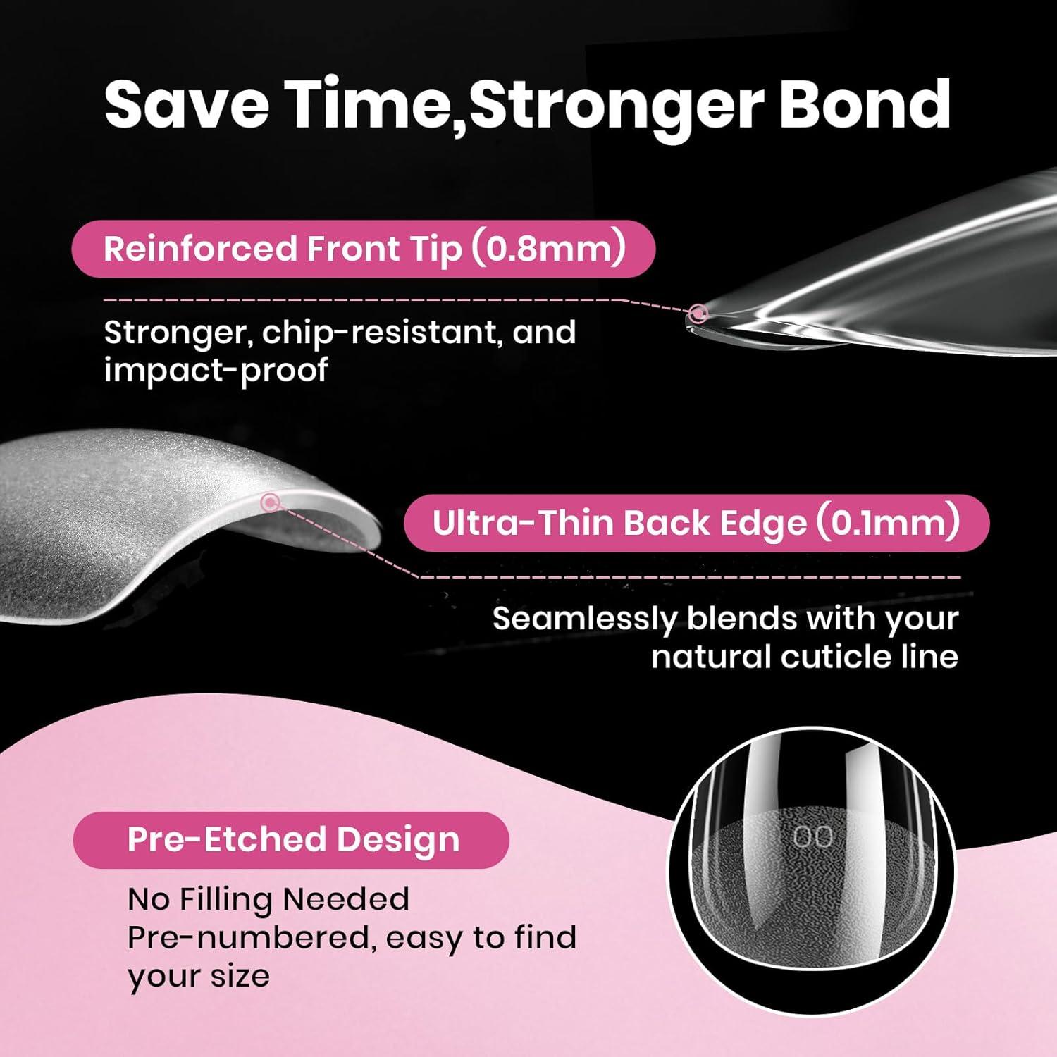 【Long Lasting 28 days+】: Upgraded pre-etched flat fake nail tips eliminate the need for shaping and filing, reducing polishing time and increasing the contact area between glue and tips for improved adhesion. The thin back edge seamlessly adheres to your natural nail, extending your nails in just 3 minutes and showing them off for over 4 weeks.