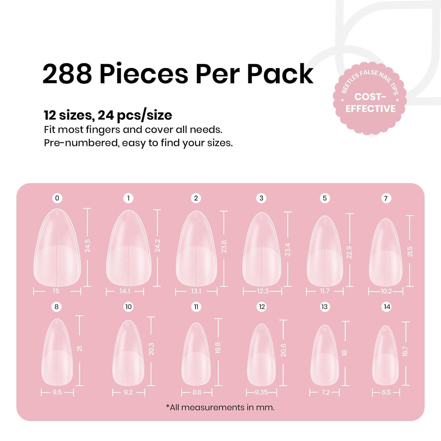 Beetles Gel Nail Tips Short Coffin Pre-Etched Nail Tips, 12 Sizes 288 Pcs Full Cover Soft Tips Half Matte False Nails Clear Acrylic Glue on Nails Extension DIY Manicure Gifts for Women(6-1-Almond Short 288pcs (Full Matte Nail Tips))