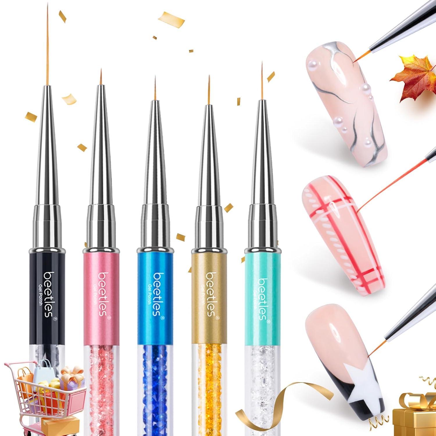 Beetles Gel Polish Nail Art Liner Brushes 5Pcs Painting Art Design Pen Set Diamond Application Rhinestone Handle Dotting Drawing Sizes 5 7 9 11 20mm Nail Design Gift for Women(5Pcs Nail Art Brushes)