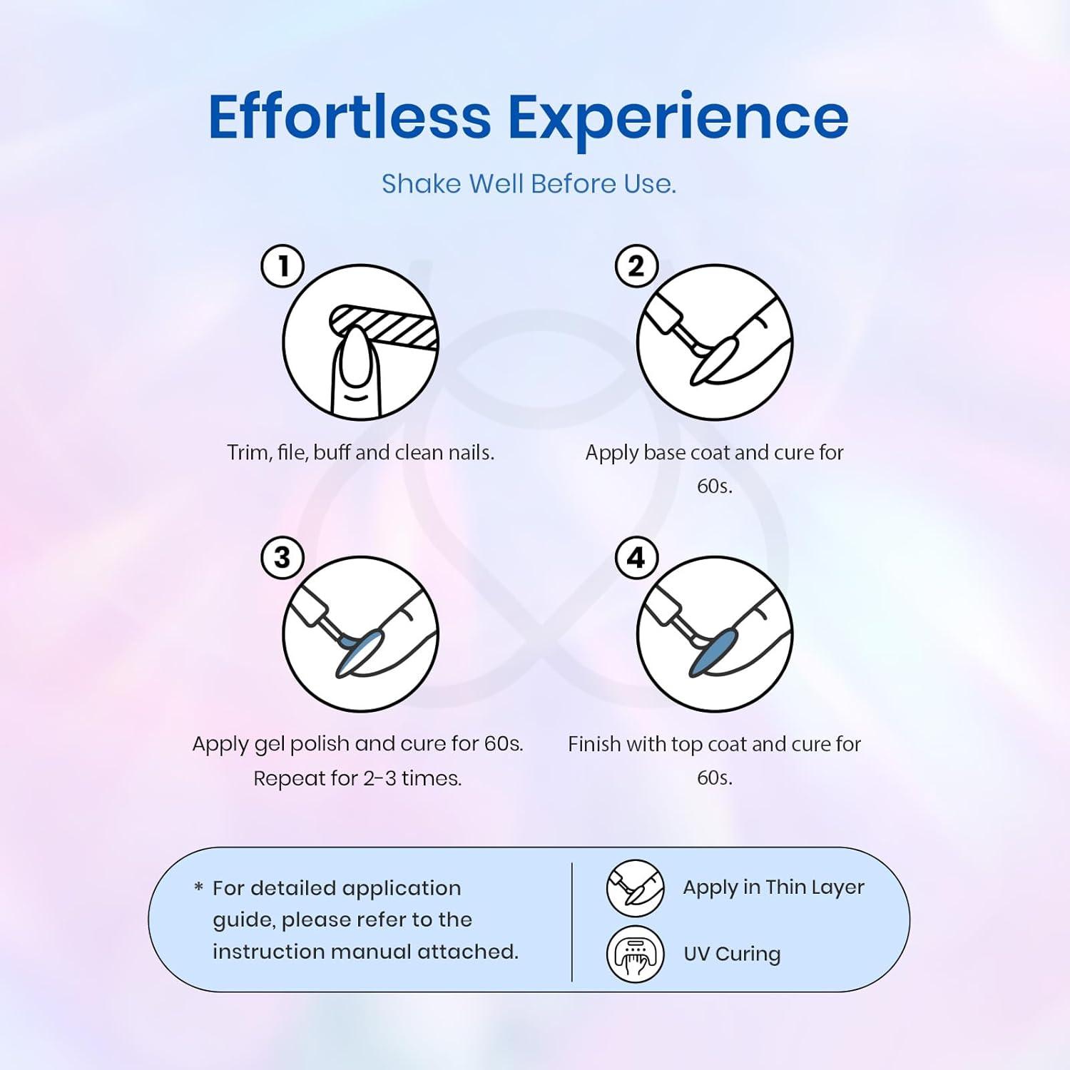 【Speed Curing with Uv/Led Lamp】The cat eye gel polish kit needs to be cured under the uv/led light. The average time for uv/led lights is 60-120 secs. It remains sticky after curing and must be used with a base coat and top coat! (Note:This item does not include a base&top coat, which needs to be purchased separately)