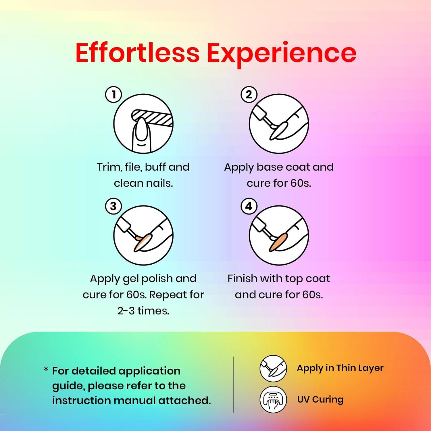 【Speed Curing with Uv/Led Lamp】The cat eye gel polish kit needs to be cured under the uv/led light. The average time for uv/led lights is 60-120 secs. It remains sticky after curing and must be used with a base coat and top coat! (Note:This item does not include a base&top coat, which needs to be purchased separately)