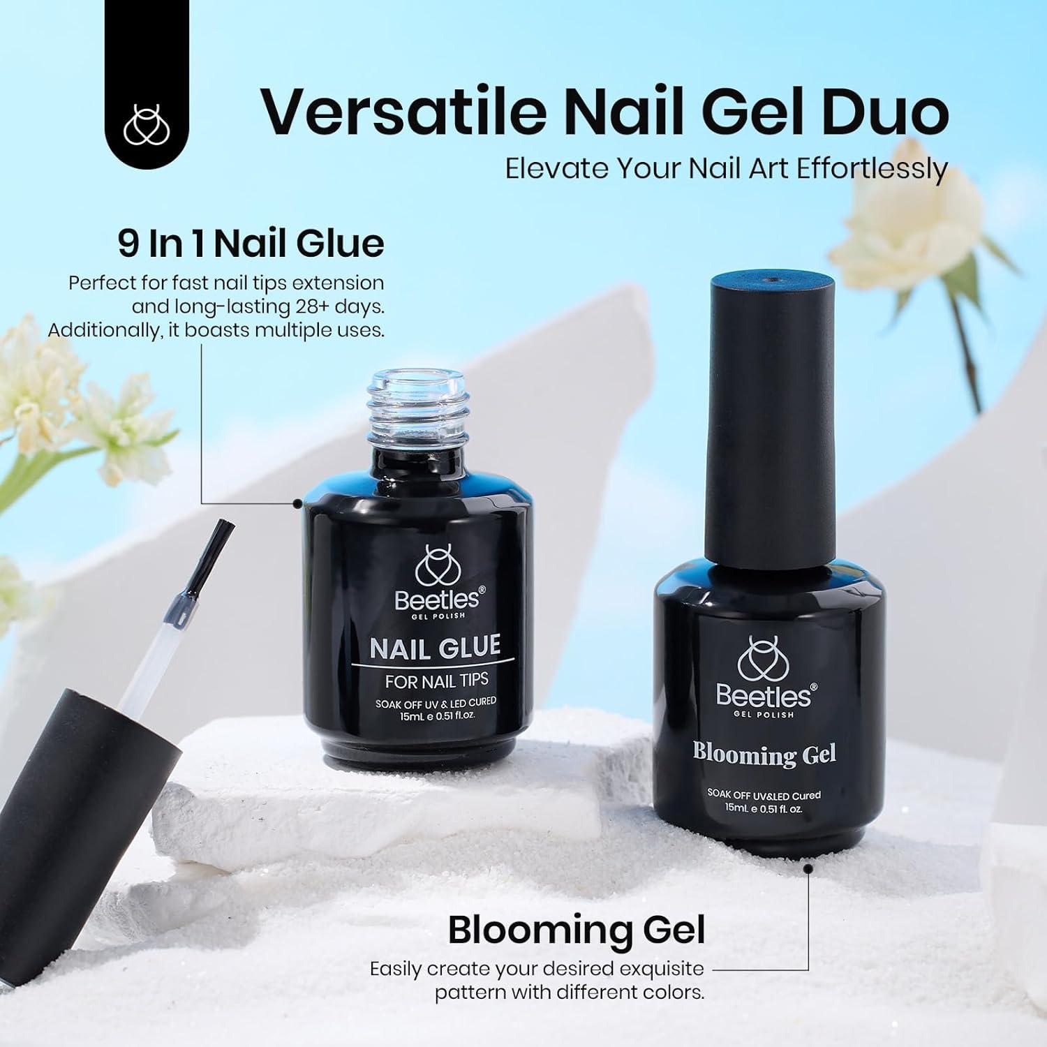 Beetles HEMA-Free Gel Top and Base Coat 15ml, TPO Free No Wipe Clear Glossy Gel Nail Polish Set Long Lasting Soak Off UV Lamp Upgraded Safe Low-Sensitivity Formula Nail Gifts for Women(0-9 in 1 Nail Glue and Blooming Gel)