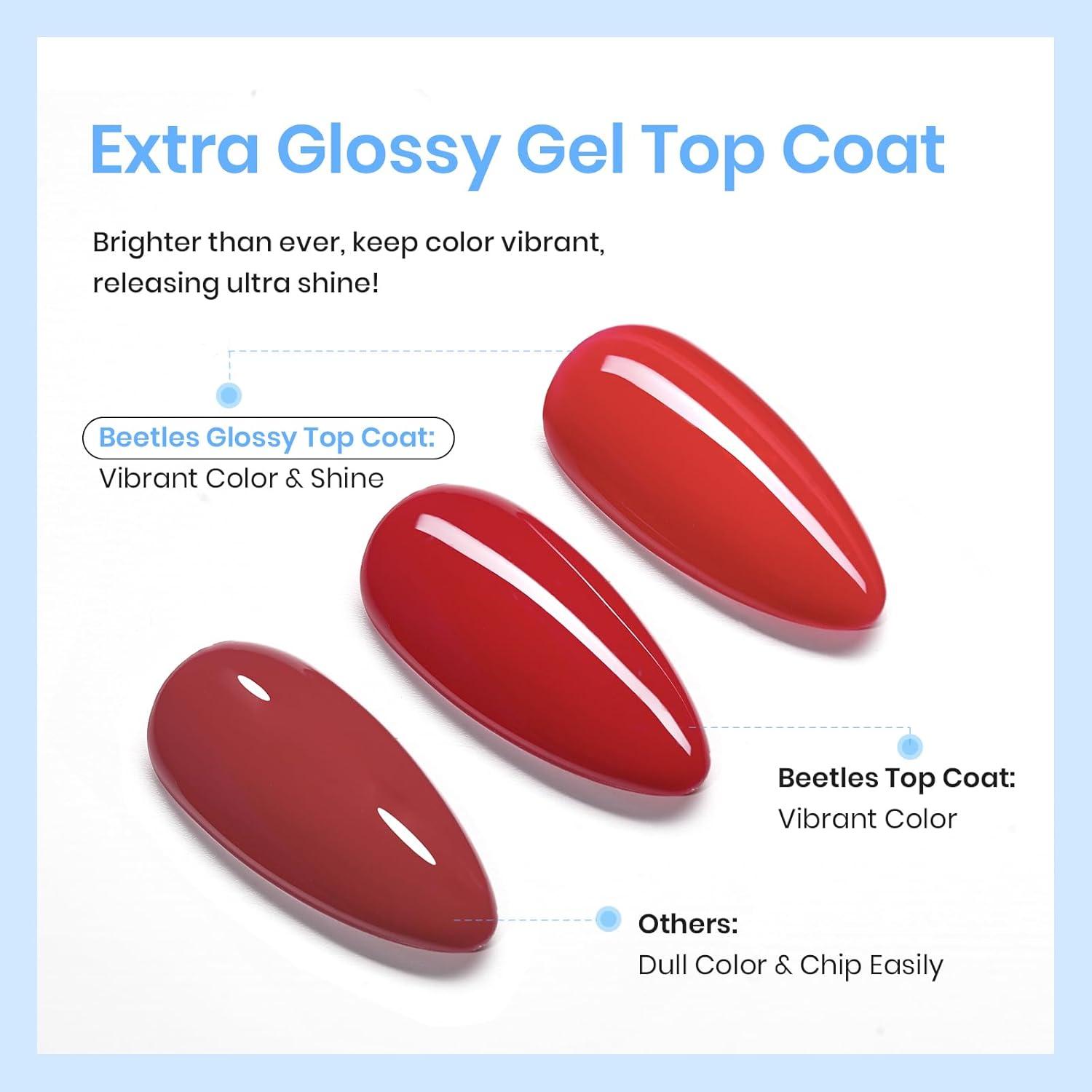 Top Coat Gel Nail Polish: 2pcs 15ml large capacity no wipe gel top coat included. No Wipe Gel Top Coat, Long-lasting with perfect shine. A flexible top coat avoids nicks, chips, or smudges. Tips: Avoid touching your nails after curing the top coat for 2 minutes to enhance the shine.
