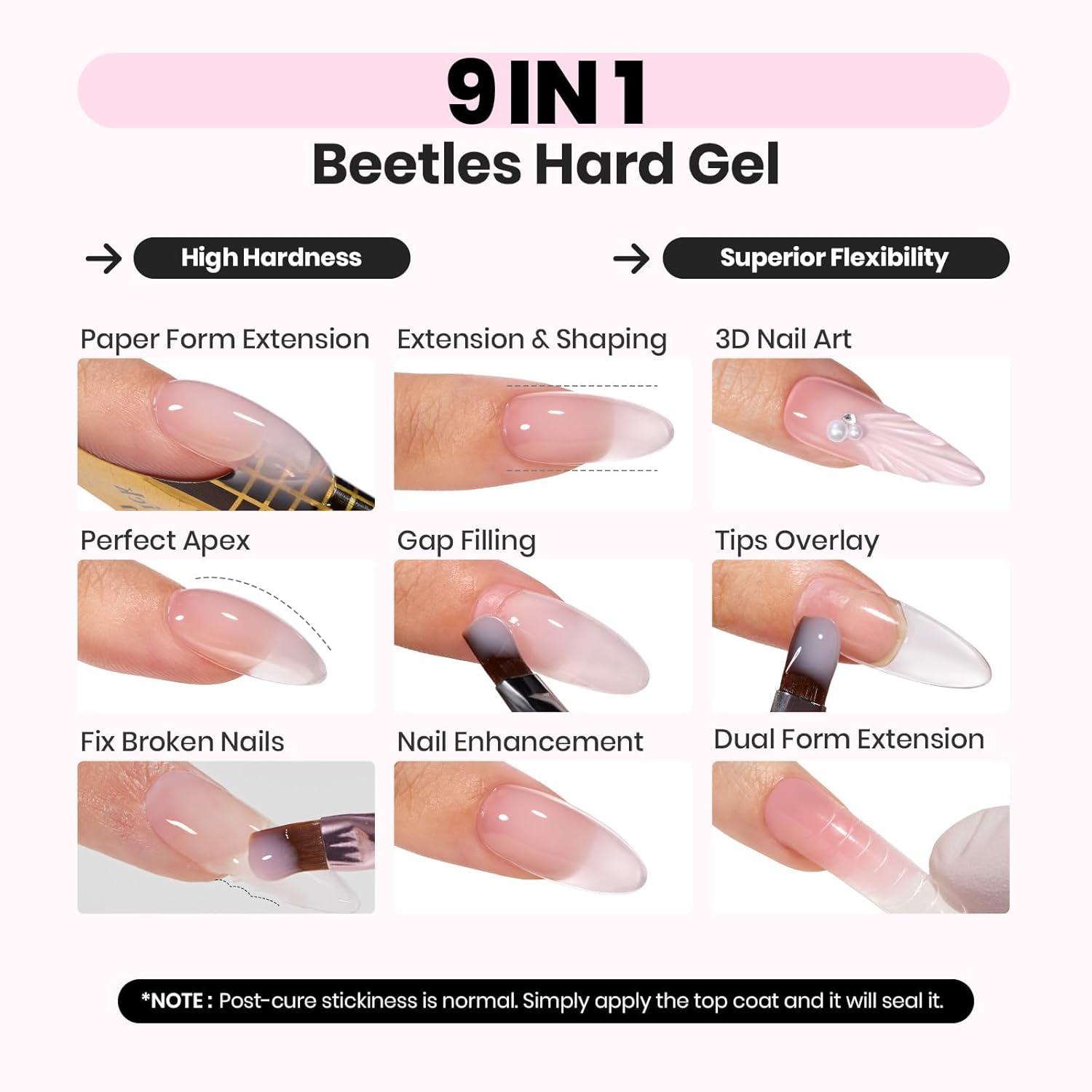 9 in 1 Hard Gel:Beetles builder gel is an all-in-one solution for nail extensions, C-curve sculpting, apex building, 3D designs, glitter mixing, gap filling, and strengthening thin nails. Its thick yet flexible texture delivers salon-quality results at home. Works great as a builder, strengthener