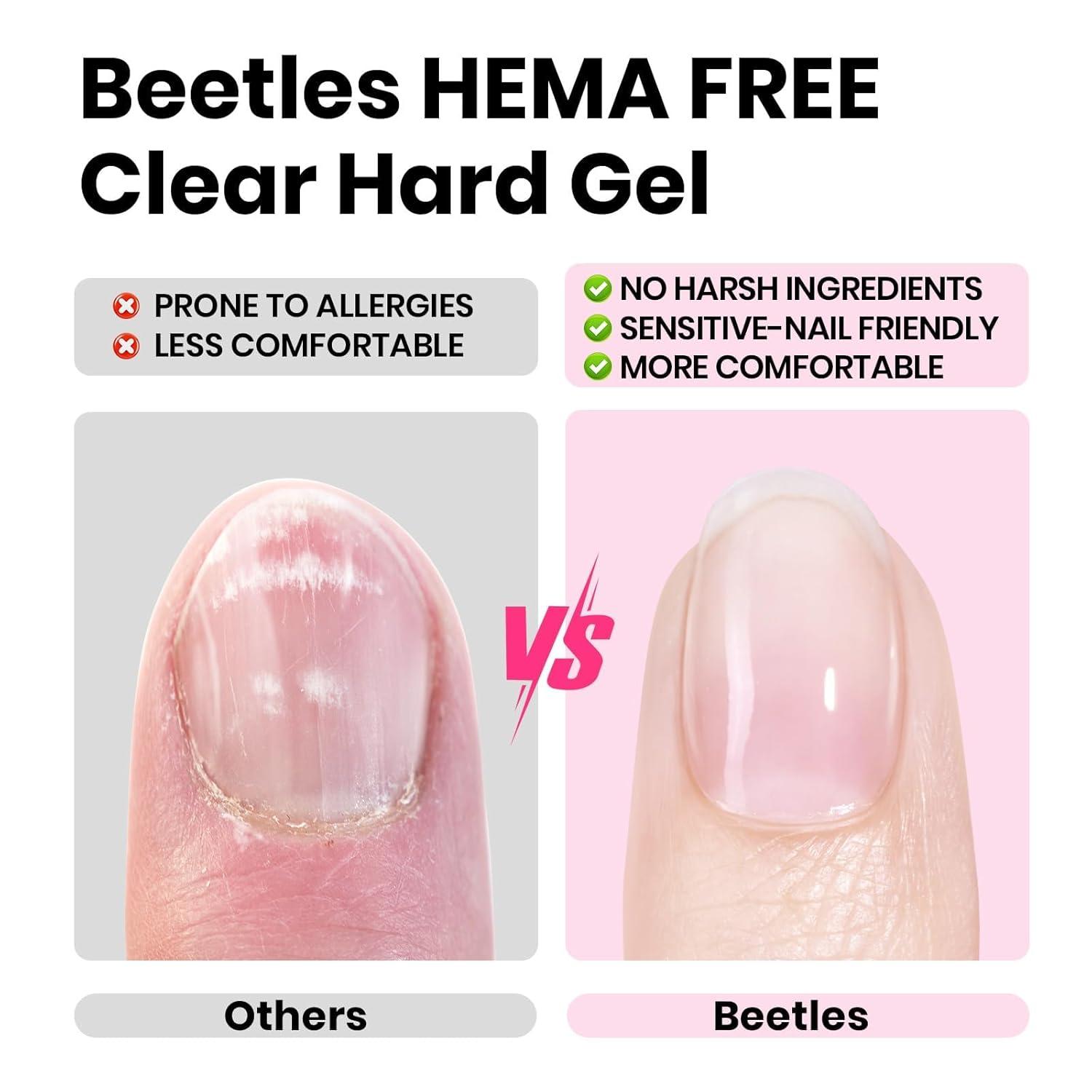HEMA-Free Hard Gel:This Beetles builder gel for nails helps reduce allergy risks and discomfort, making it a safer choice for both DIY users and professional salons. It minimizes heat spikes during curing, enhancing the overall experience for clients and reducing complaints about burning or irritation. Ideal for nail techs who prioritize comfort and safety