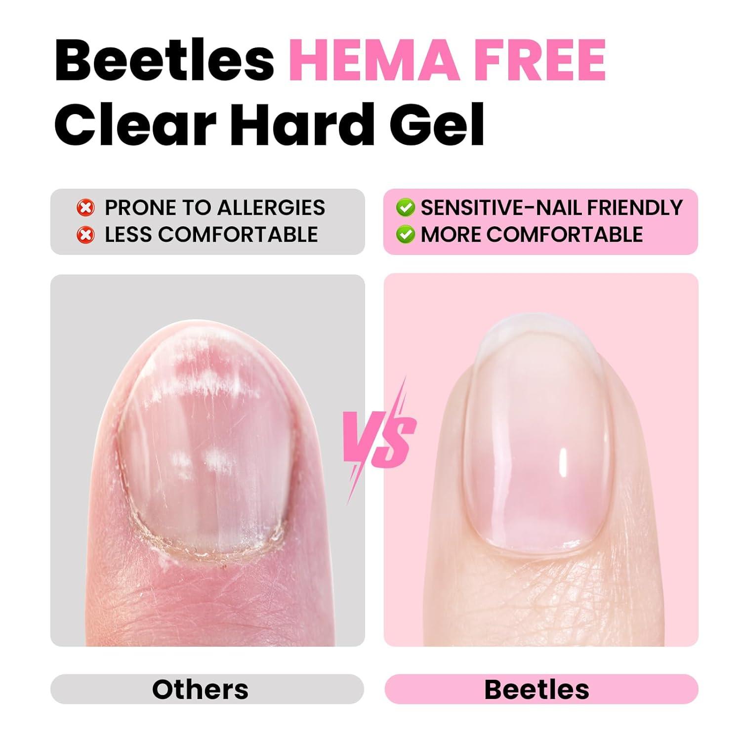 HEMA-Free Hard Gel:This Beetles builder gel for nails helps reduce allergy risks and discomfort, making it a safer choice for both DIY users and professional salons. It minimizes heat spikes during curing, enhancing the overall experience for clients and reducing complaints about burning or irritation. Ideal for nail techs who prioritize comfort and safety