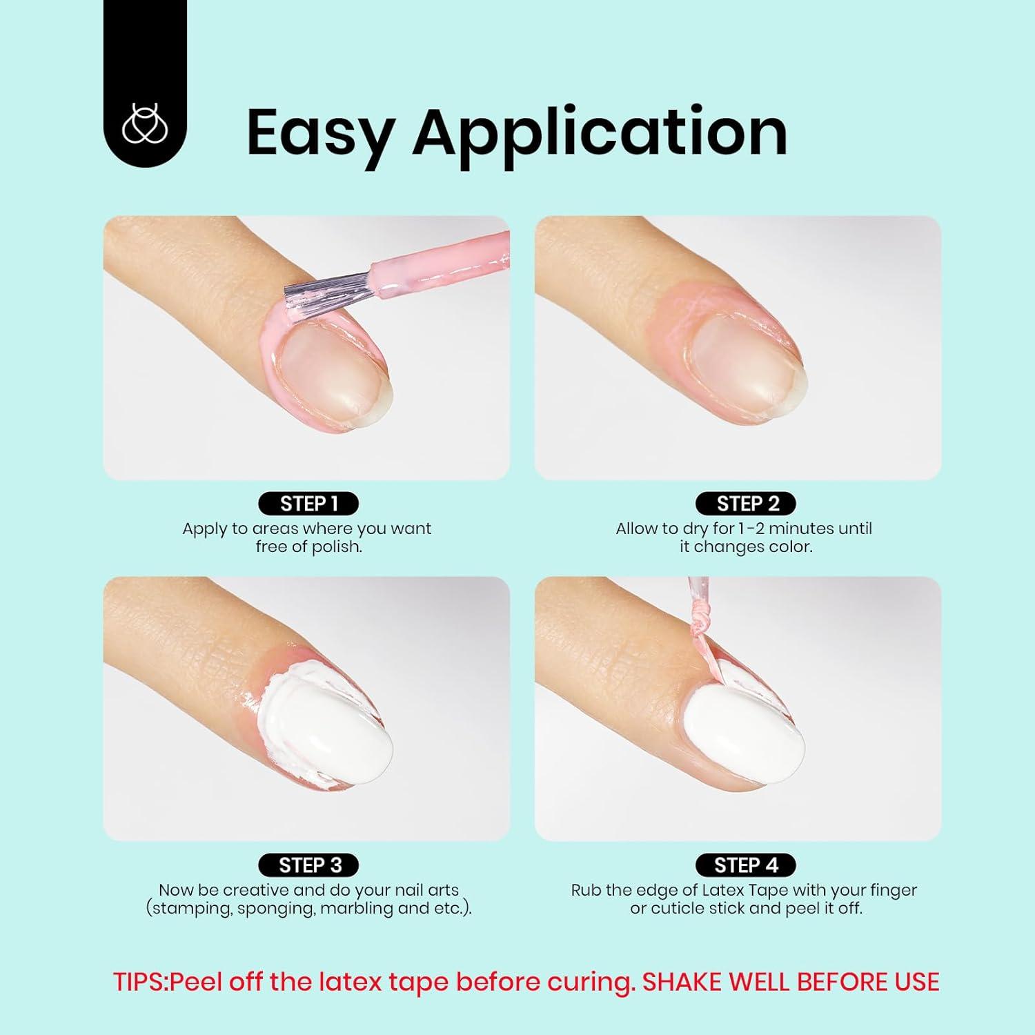 Using Step: 1. Apply to areas where you want free of polish. 2. Allow to dry for 1-2 minutes until it turns clear. 3.Create your desired nail art style(stamping, gradient, marbling or etc.) 4. Rub the edge of Latex Tape with your finger or tweezers and peel it off.