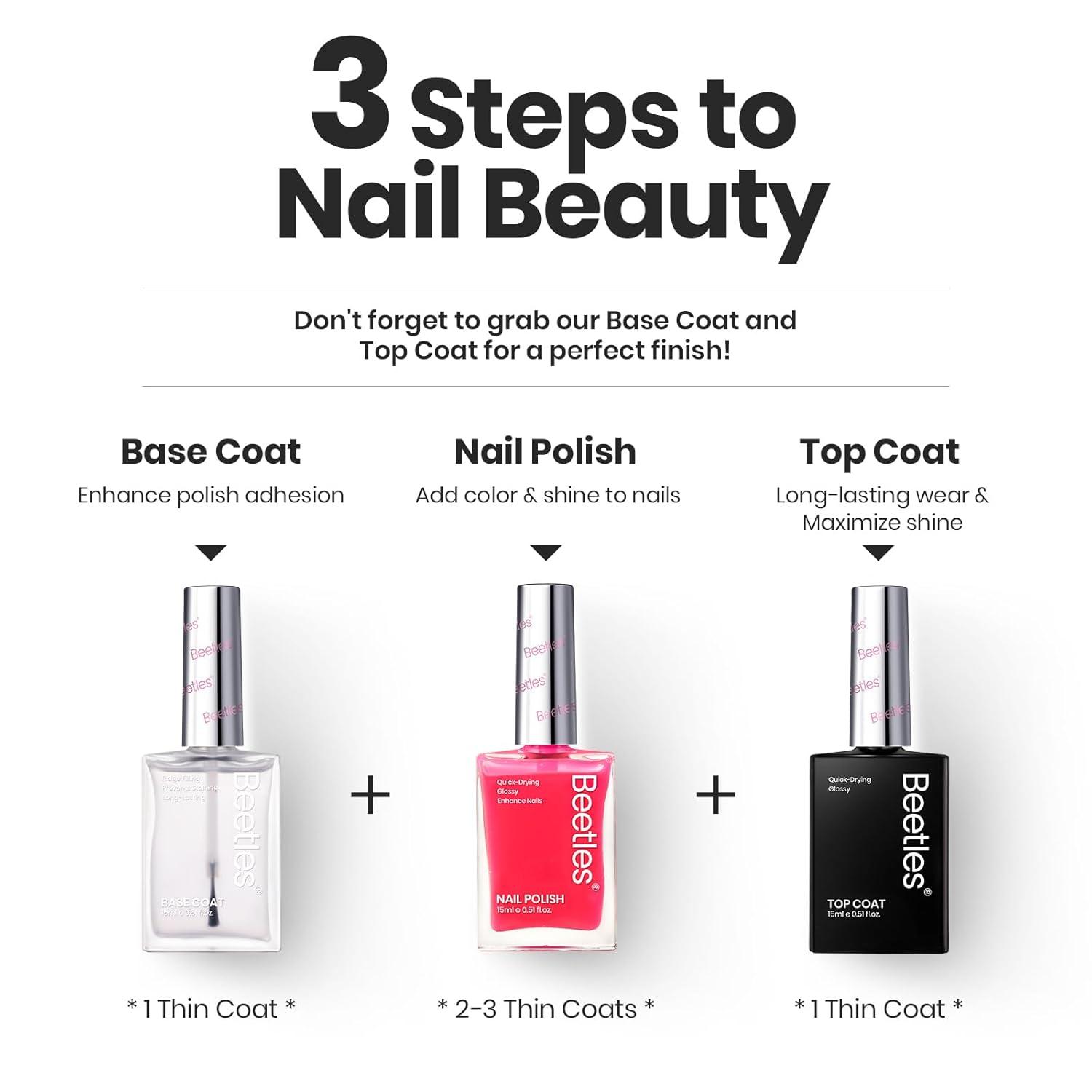 【Long-Lasting Shine】Beetles quick dry nail polish enjoys a bright color and high gloss that lasts for at least 8 days without discoloration or paint peeling. It is very durable, and is an ideal choice for festivals or special occasions, as well as an ideal gift for nail lovers! It need to be used with a base coat and top coat!This item does not include base&top coat, which needs to be purchased separately.