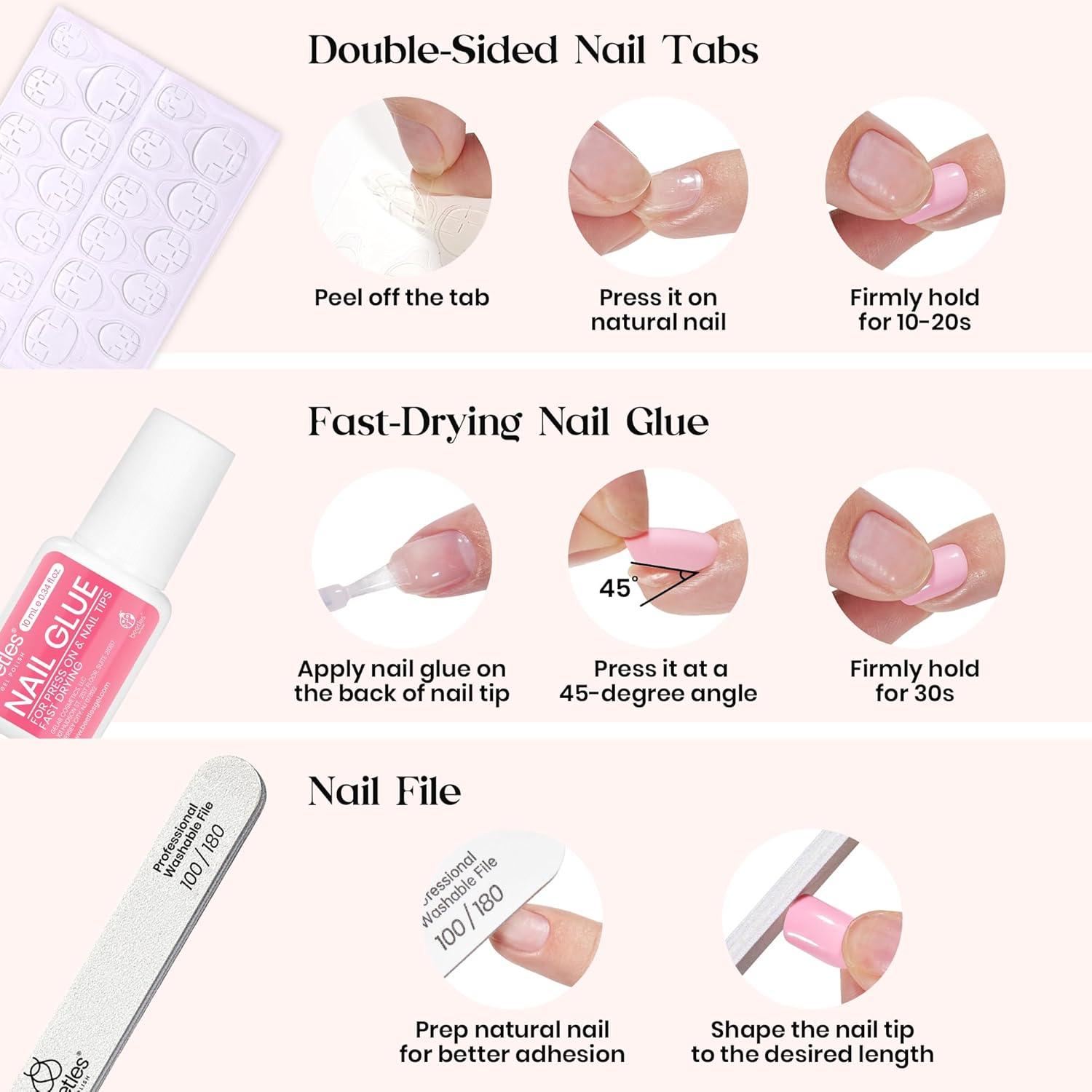 【High Quality】Beetles press on nails pack are like the texture of nail polish, the nails are soft, light and thin and made of high quality ABS material, which is not easy to break. No need base coat, convenient and easy for nail art, also can be reused. The bottom of the false nail is flexible that can fit your natural nails well and don’t hurt our nail edges and the top is more solid to avoid folding.