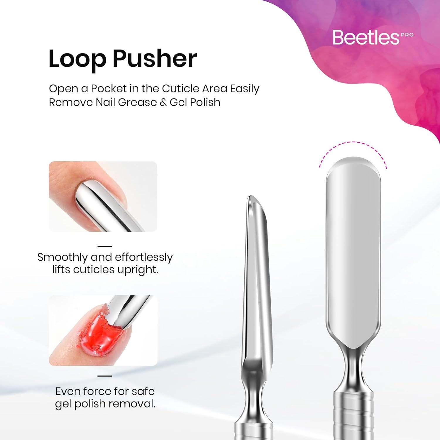 Professional Cuticle Pusher: The Beetles Professional Nail Cuticle Pusher Pro is dual ended with 23mm loop pusher and 9mm beveled pusher. The handle has anti-slip threads, which can evenly distribute force and will not make your hands tired after holding it for a long time.