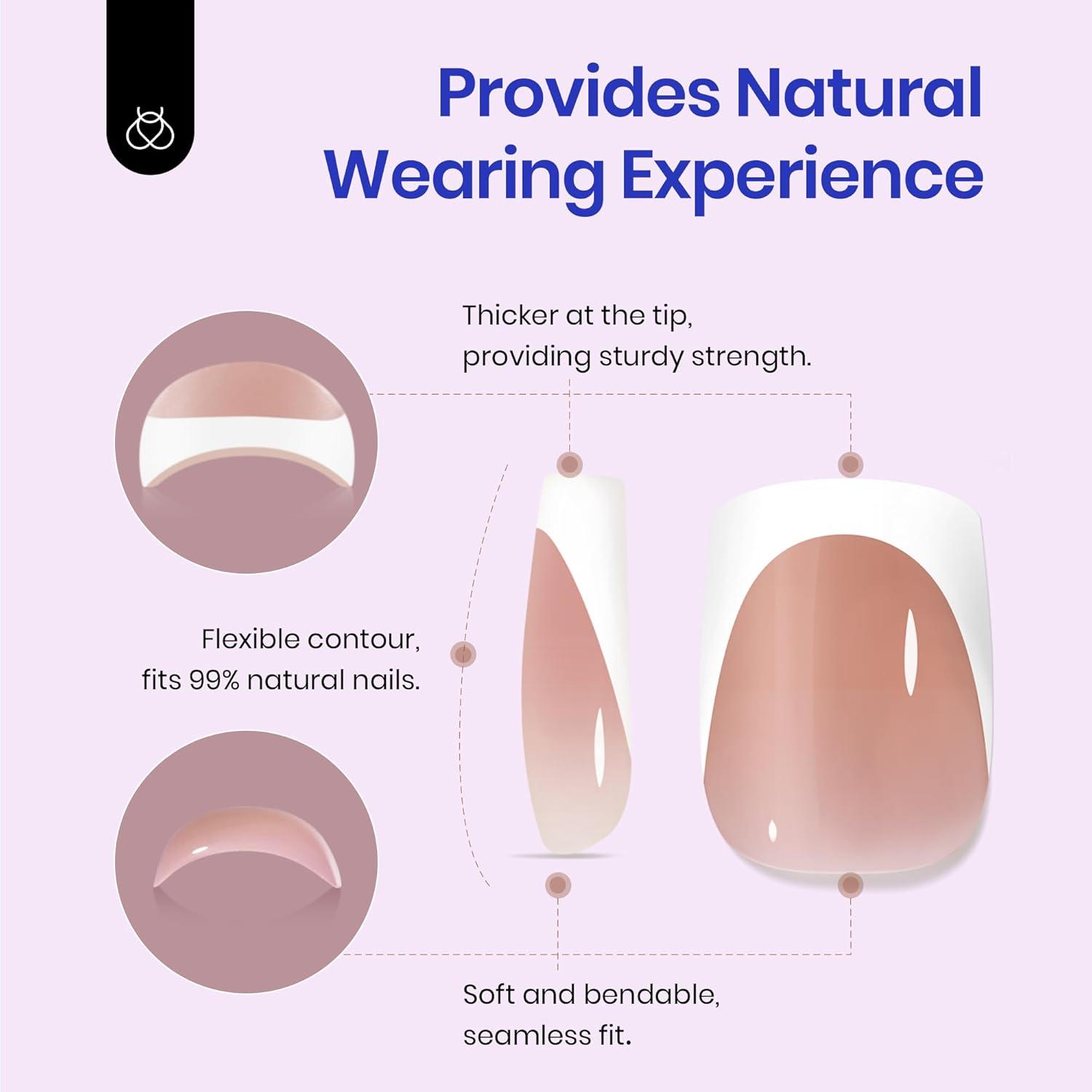 【Upgrade 5-In-1 Press On Nails】Beetles 5-in-1 pink french tip short square press on nails are made with primer, soft gel nail tips, color gel, french tip and top coat. Top coat provide ultra-protection for french tips, and we thickening the front edge of the new french tips press on nails, which is tough and not easy to break. With proper use, it can be maintained for 28+days