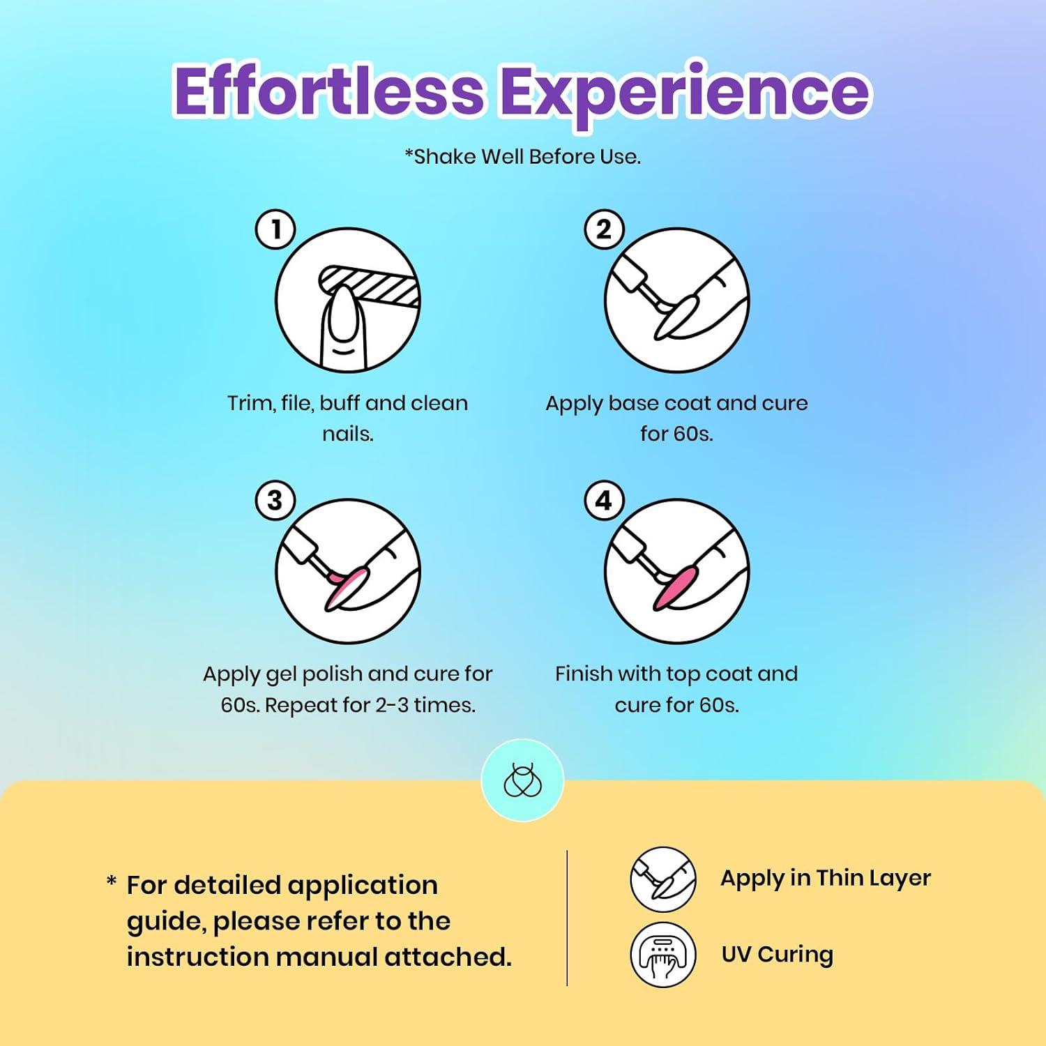 Essential Gel Nail Kit for Easy At-Home Manicure: Features essential gel nail products including base coat, top coat, specialty top coat, liner gel, nail care oil, and simple nail tools. Designed for easy application and smooth, glossy results when used with a UV/LED nail lamp. With proper application, enjoy a shiny, chip-resistant finish that lasts up to 28 days.