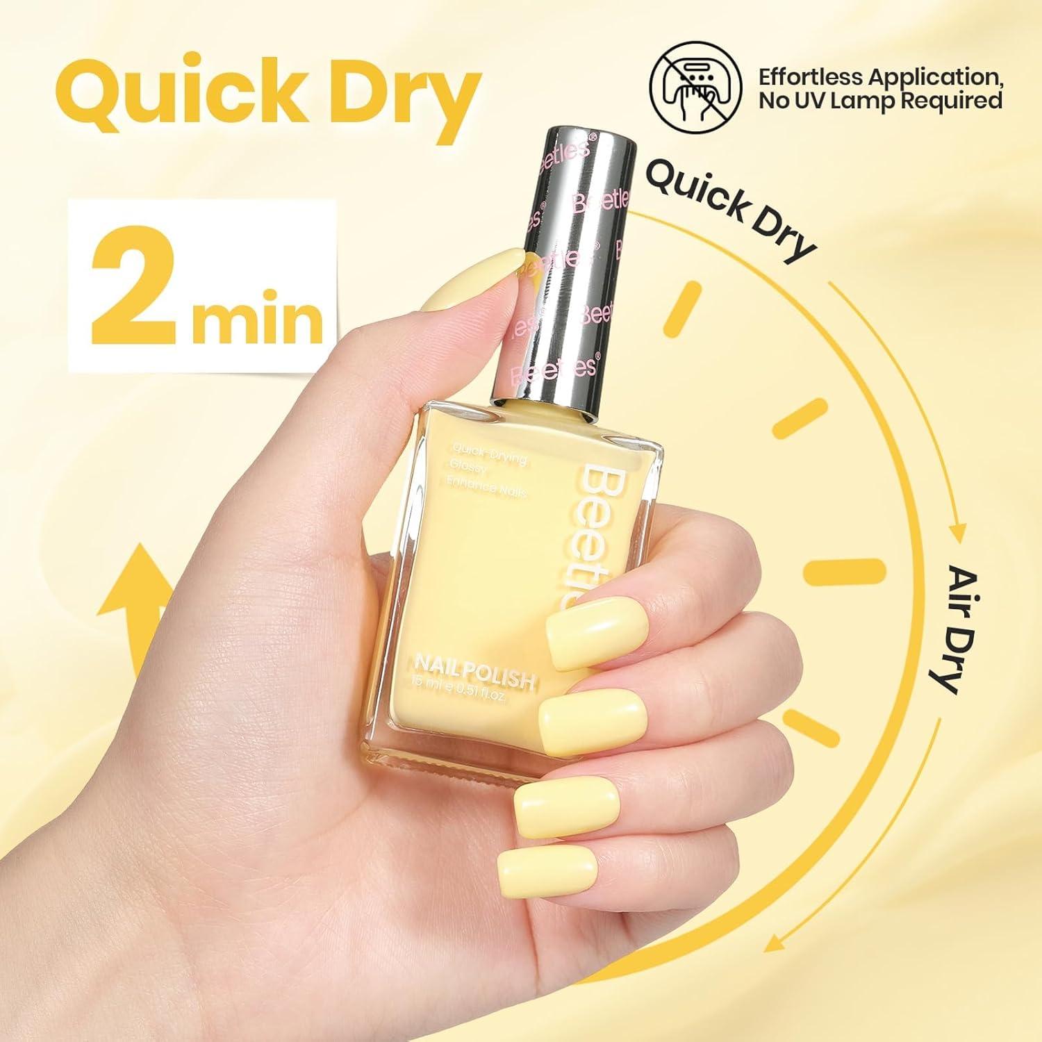 【High Gloss Finish】Beetles nail polish yellow can present a soft effect, exude fashion and charm, and elevate your nails to another level! Fingernail polish is also easy to remove. Just dip a cotton pad into an appropriate amount of nail polish and gently wipe the surface.