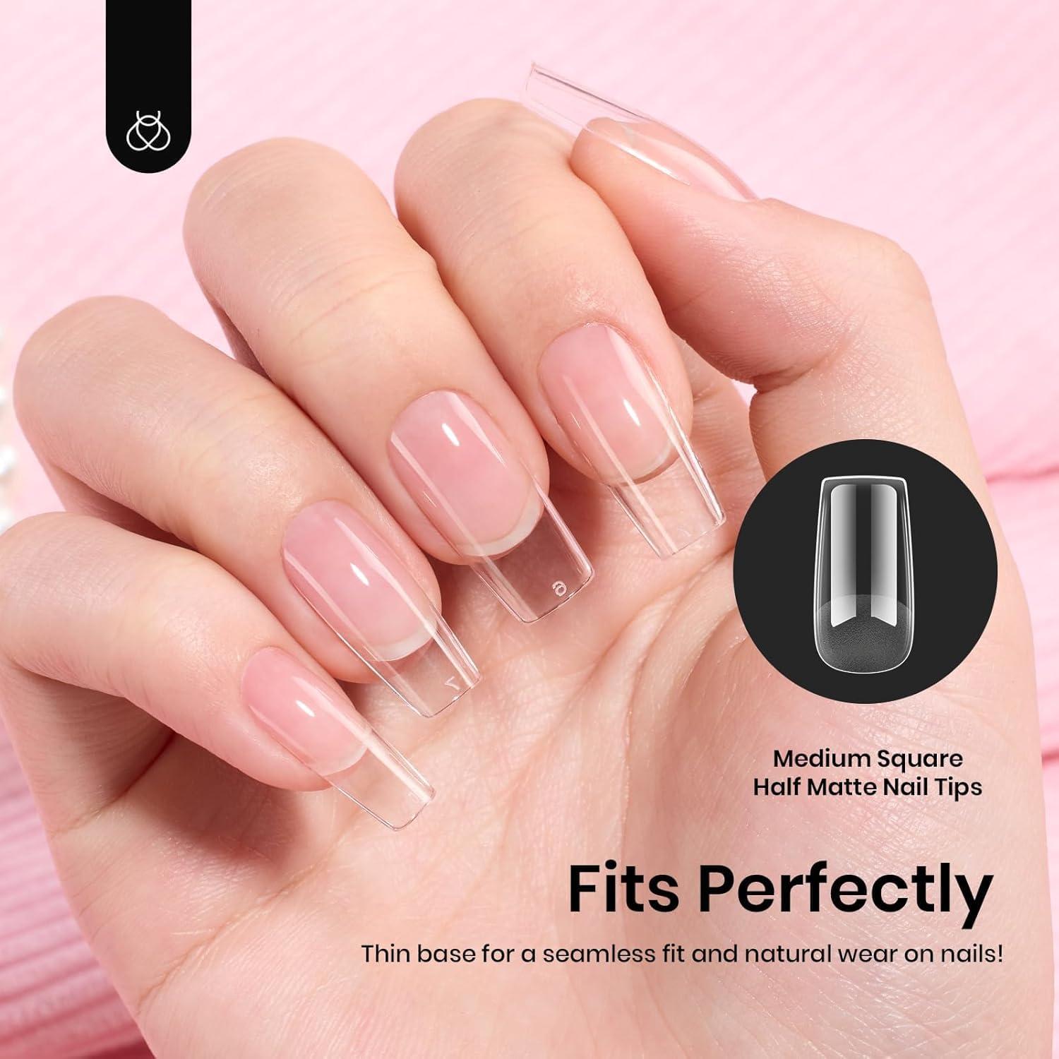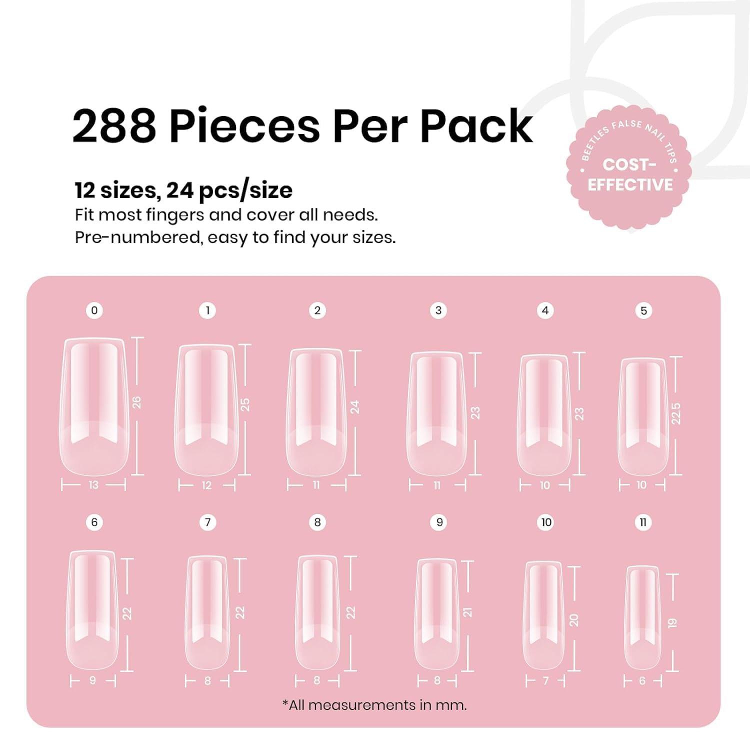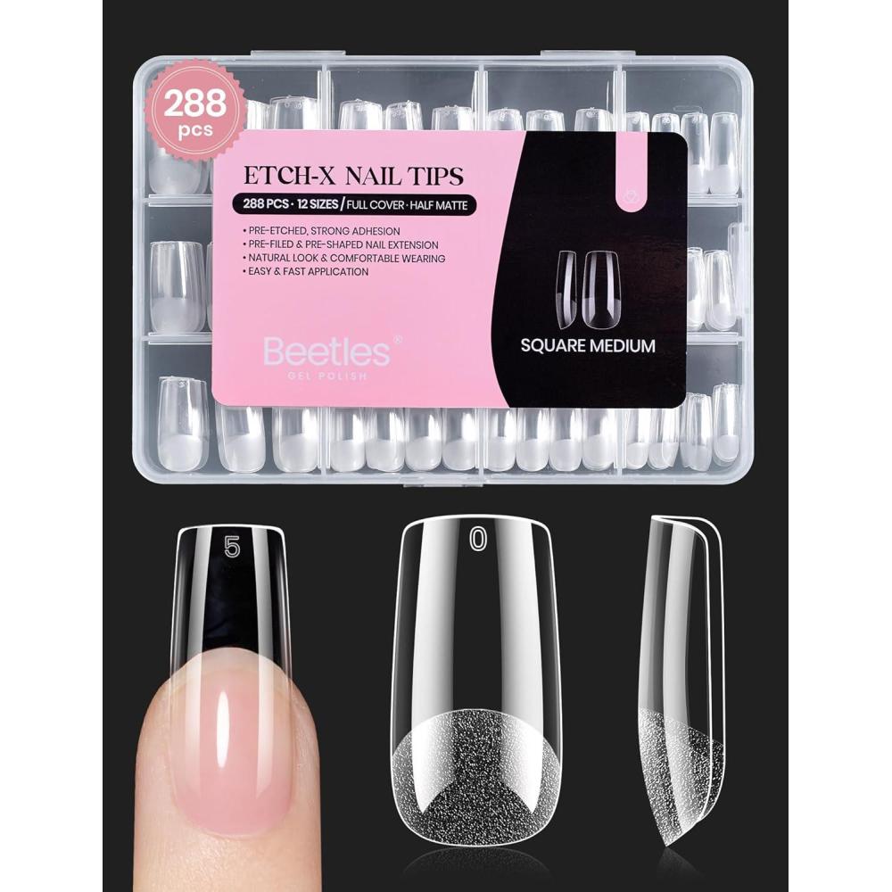 Beetles Super Strong Nail Glue 10g for Press On Nails, No Uv Lamp Needed, Quick Drying, Long Lasting, Easy Control Semi Solid Nail Glue for False Acrylic Nails(3-4-Square Medium 288pcs (Etch X Nail Tips))