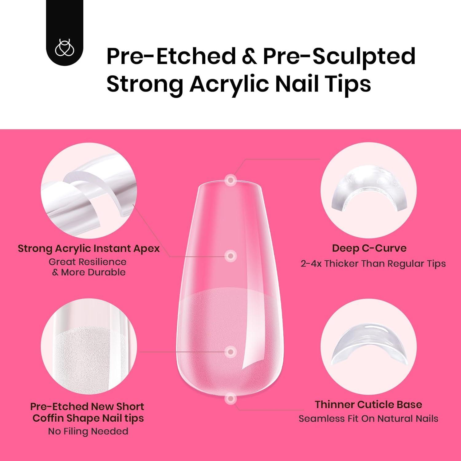 Beetles Tipex Gel Nail Kit with 224Pcs 16Sizes Medium Coffin Apex Nail Tips C Curved , Pre-building Acrylic Nails with Tipex Nail Glue,Mini Nail Lamp, Nail File for DIY Nails or Salon Use(0I-Coffin Short 224pcs (Tipex Nail Kit))