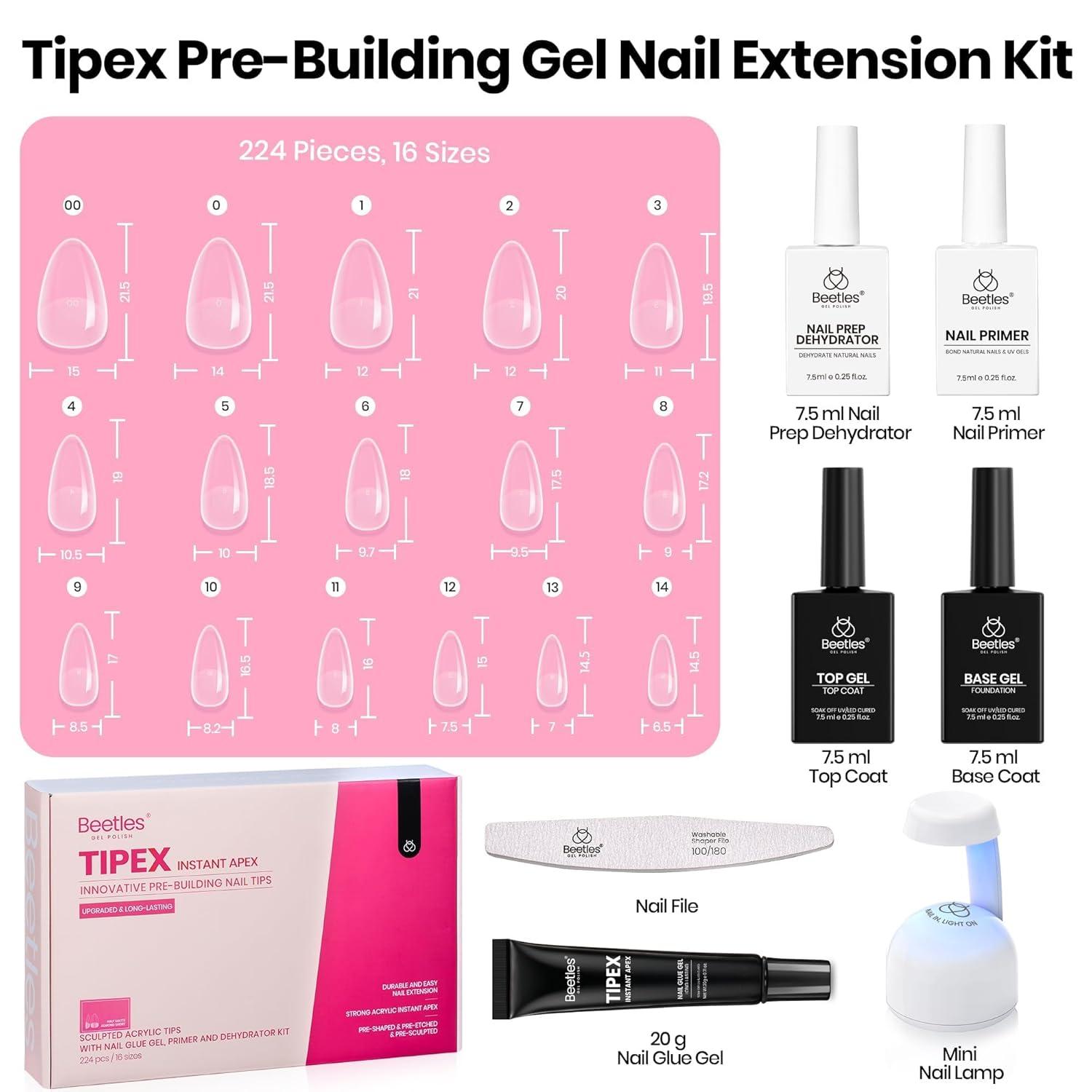 Beetles Tipex Pre-Building Gel Nail Extension Kit – All-in-One Solution for Nail Lovers:Everything you need in one kit: 224PCS pre-etched nail tips (16 sizes), 20g Tipex nail glue gel, mini UV lamp, nail file, dehydrator, primer, base coat, and top coat. Perfect for achieving salon-quality nail extensions at home, whether you're a beginner or a pro.