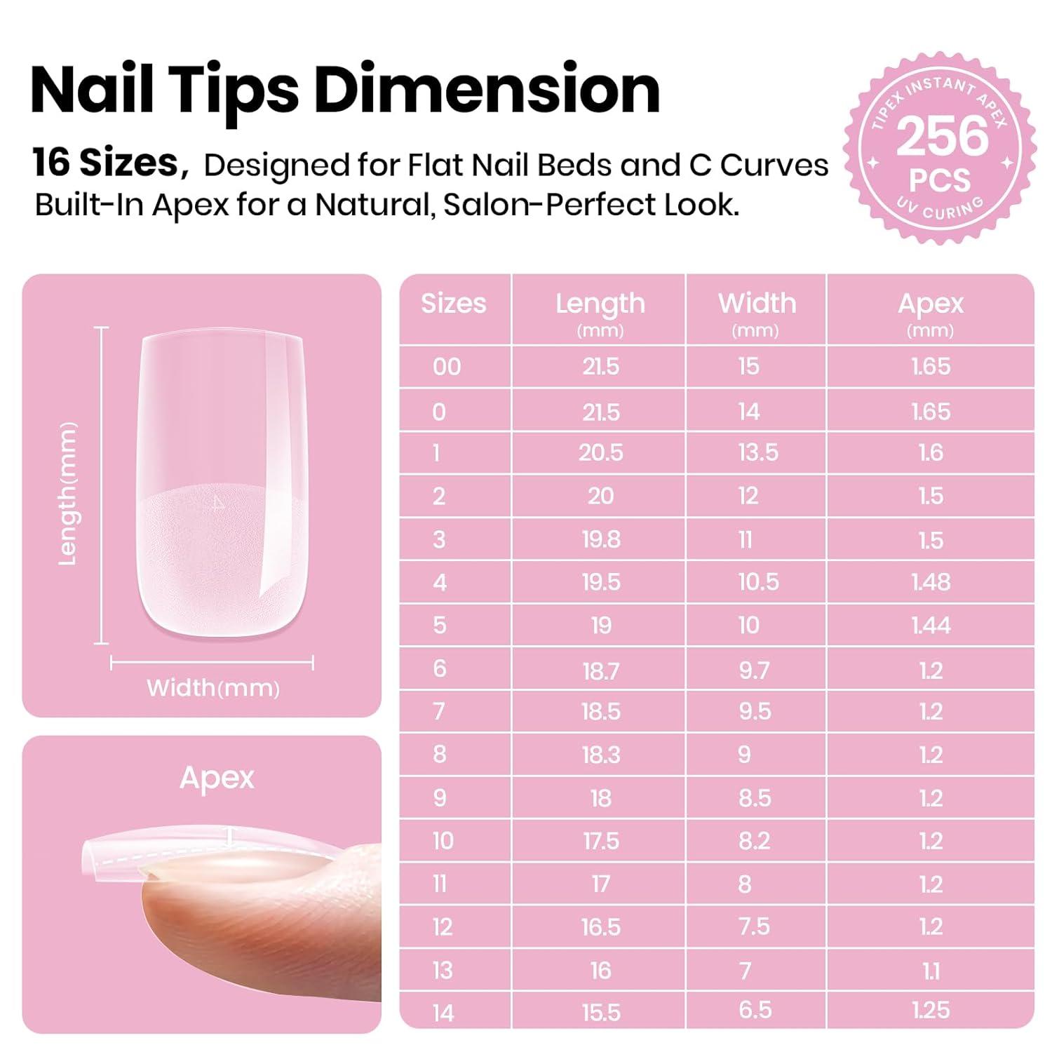 Beetles Tipex Lite Pre-Built Apex Nail Tips Kit, Square Short, 256pcs 16 Sizes, with Tipex Nail Glue, Dehydrator, Primer, Base & Top Coat, Mini UV Lamp, All-in-One Gel Nail Kit(2E-Tipex Lite-Square Short 256pcs)