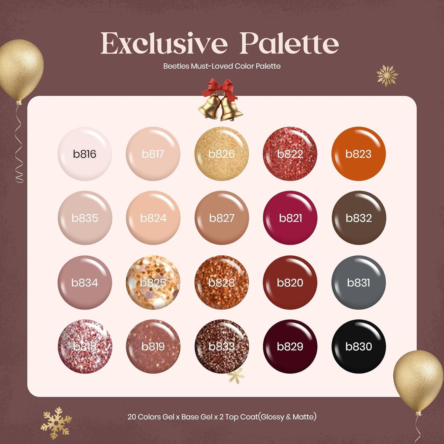 What you get: Beetles 2025 nails trend color includes 20 gorgeous shades of amber twilight Christmas gel nail polish Kit. It comprises 5 cat eye gel polish colors + 3 glitter Christmas gel nail polish + 12 regular autumn fashion color gel + 3 no-wipe base coats and glossy & matte top coats (7.5ml each bottle).