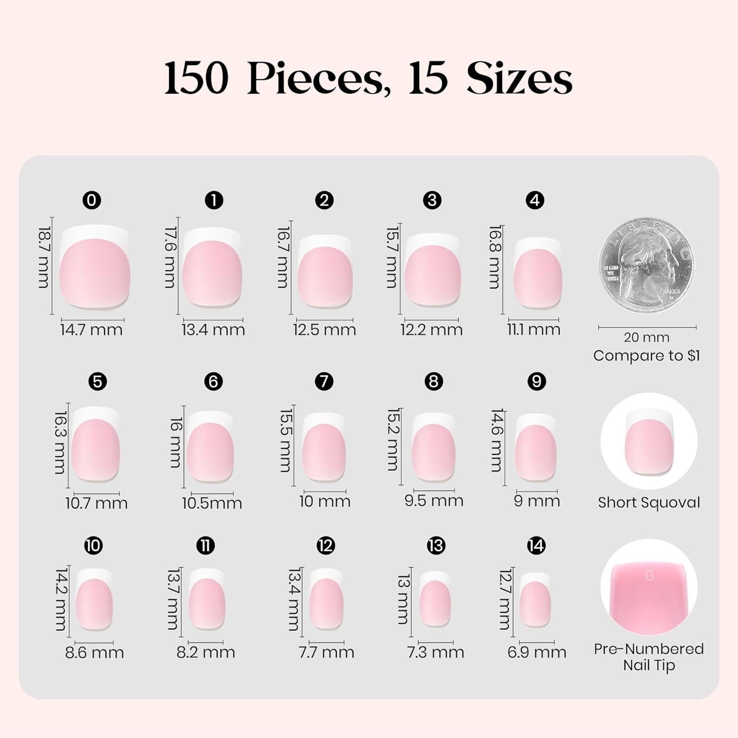 Beetles X Press French Tip Toenails – Charm French | Glossy Pink Short Square Press On Toe Nails | 150 Pcs 15 Sizes Natural Salon Quality Gel Nail Tips For Women(05-S Square-Glow French Kit)